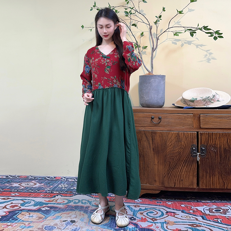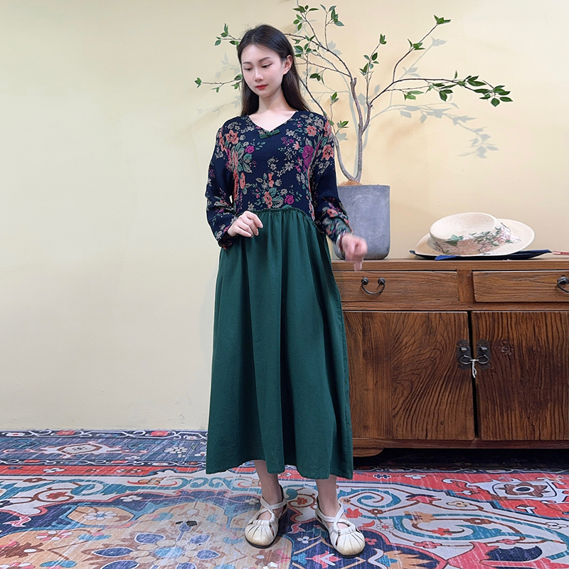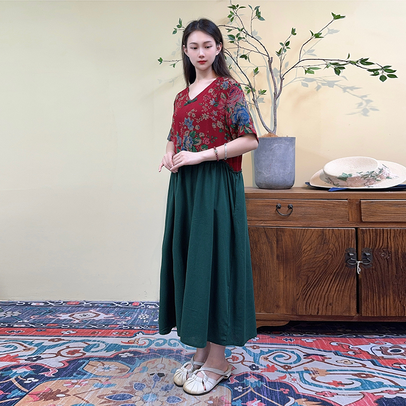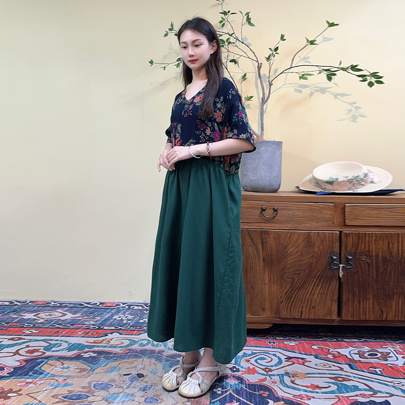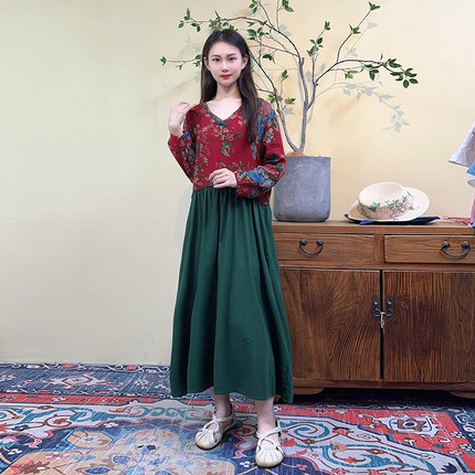 复古文艺民族风印花拼接设计感棉麻连衣裙民族风女装春夏季亚麻裙