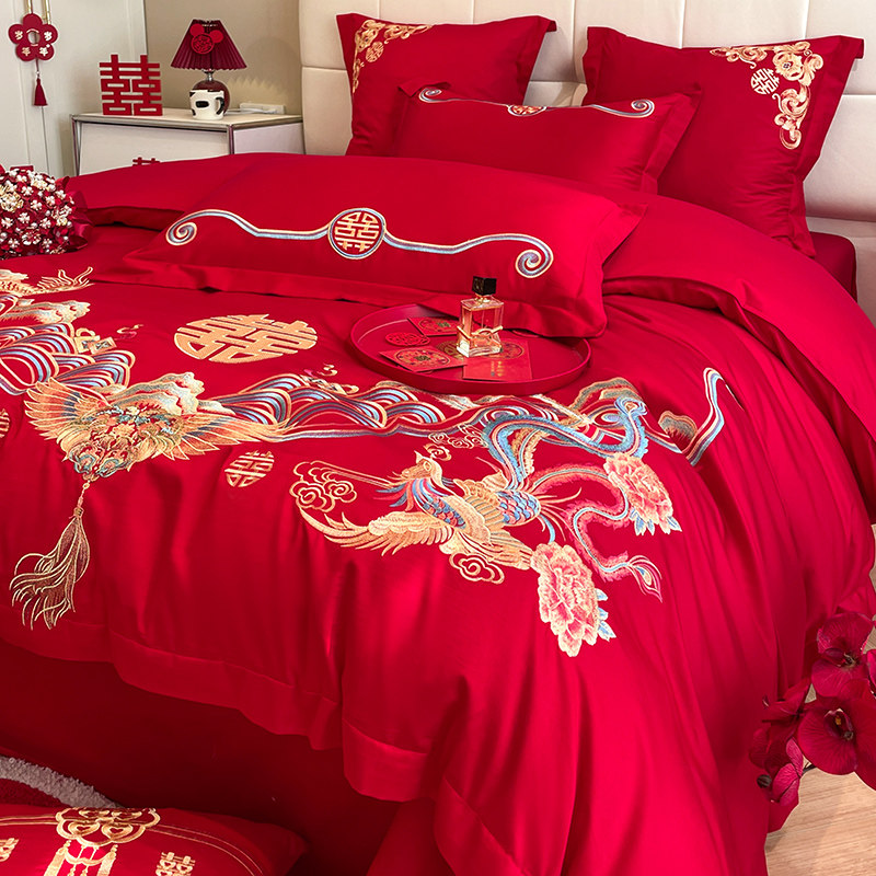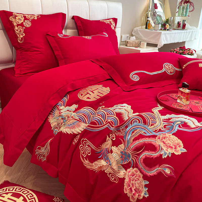 中式龙凤刺绣结婚四件套大红色床单被套喜被婚庆床上用品