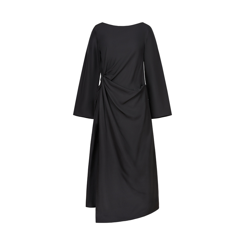 LESS春桑蚕真丝腰部打褶显瘦高级设计感黑色长袖连衣裙2O2G10420