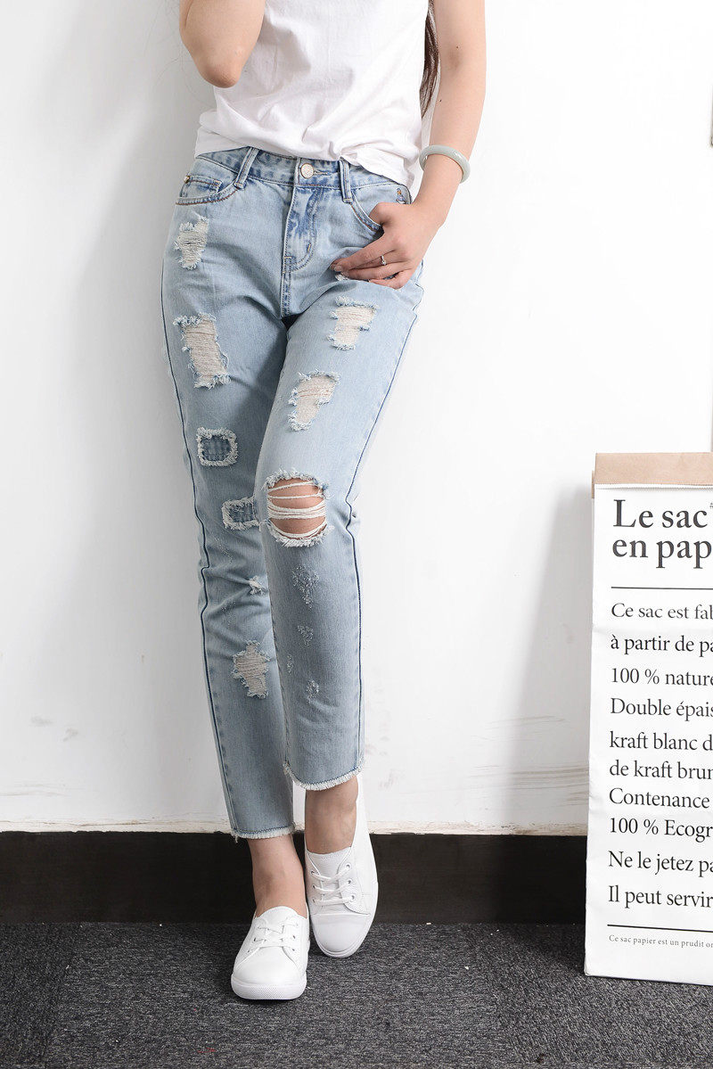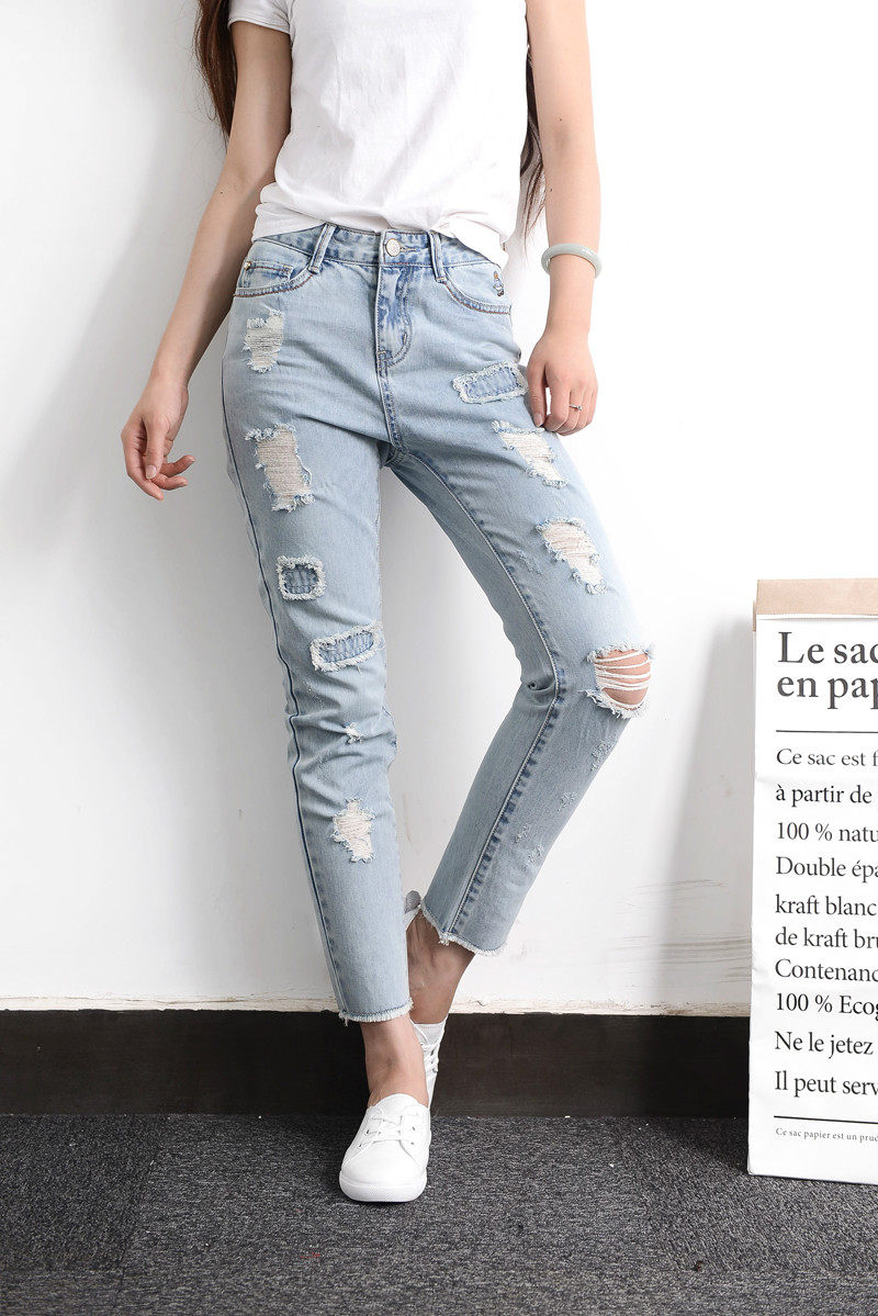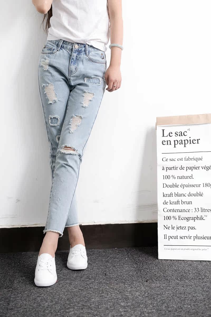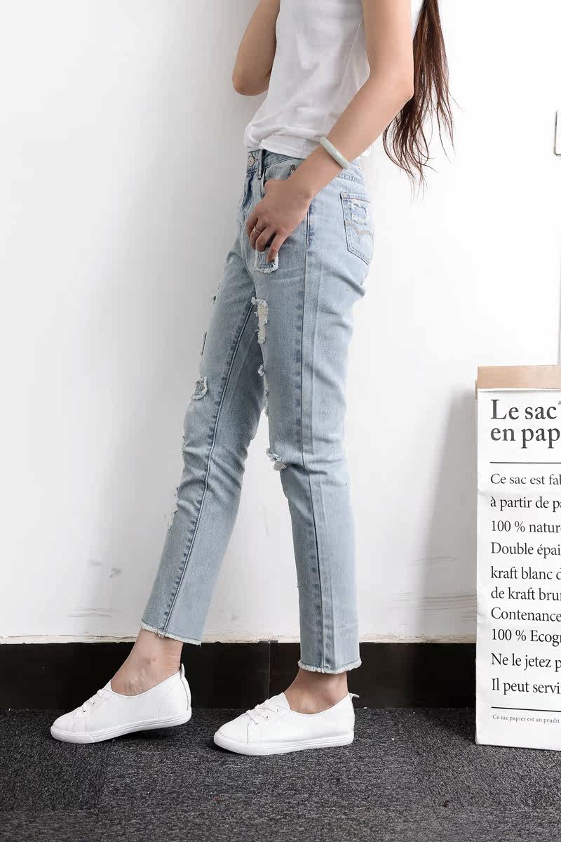春夏BF风 破洞贴布 纯棉无弹力宽松女牛仔九分裤 小直筒裤