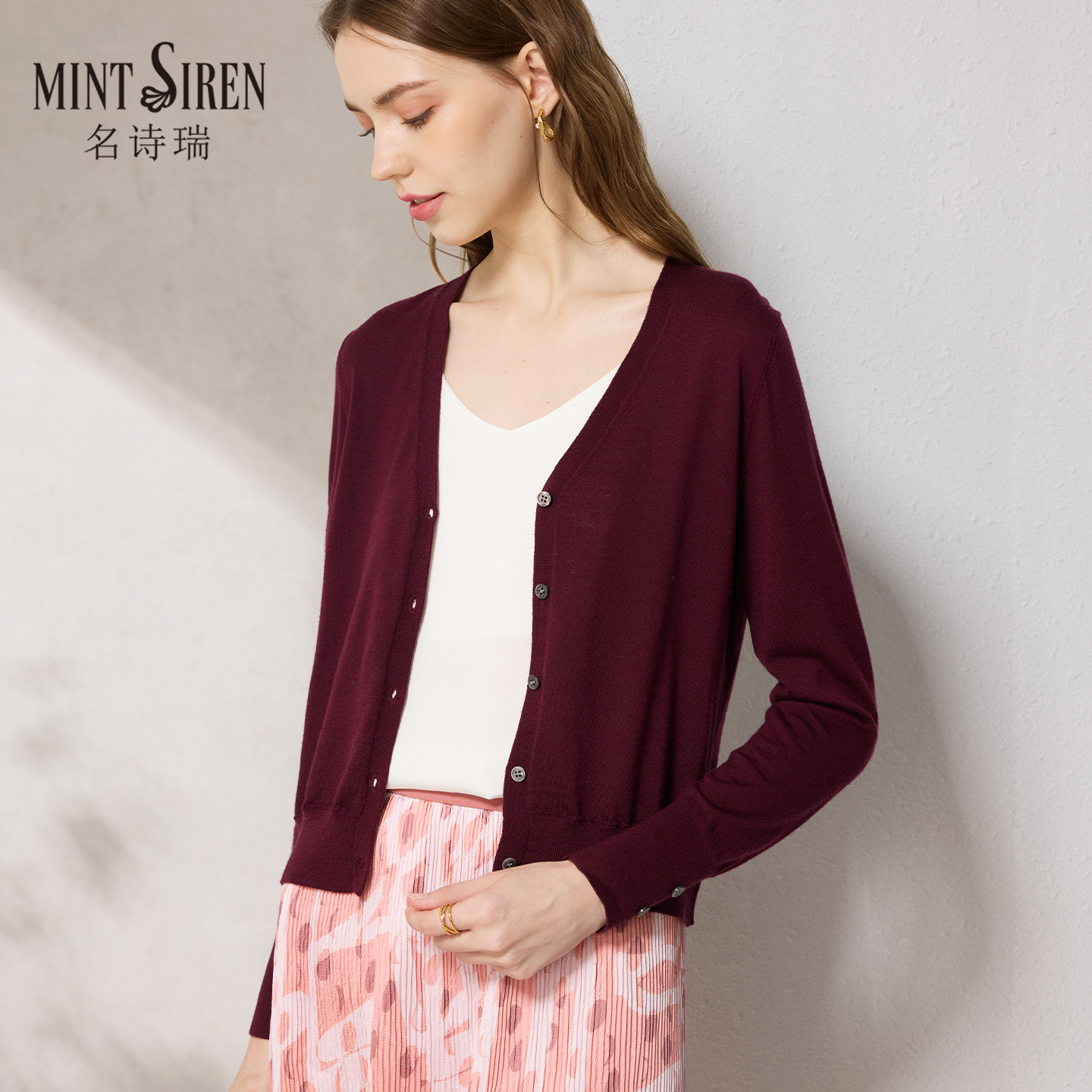 秋季新品V领短款纯羊毛针织开衫女长袖基础外搭酒红色薄外套上衣