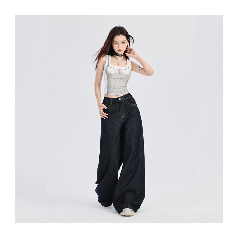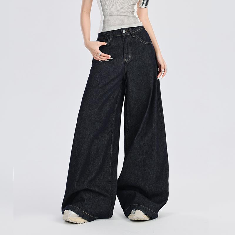 ZXZA深蓝色慵懒风阔腿牛仔裤女2024春夏新款宽松显瘦拖地直筒裤子