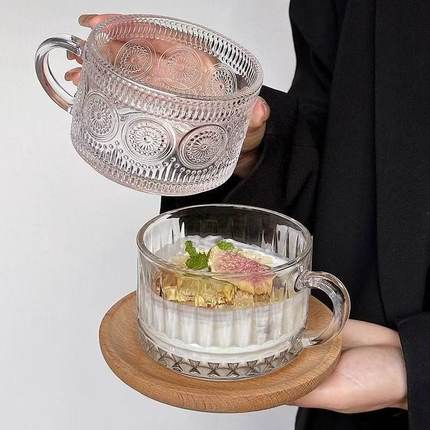 玻璃杯浮雕喝水茶杯多款牛奶早餐饮料果汁咖啡杯复古甜品燕麦杯子