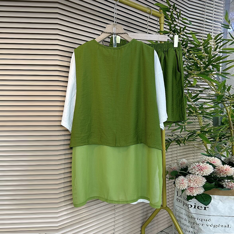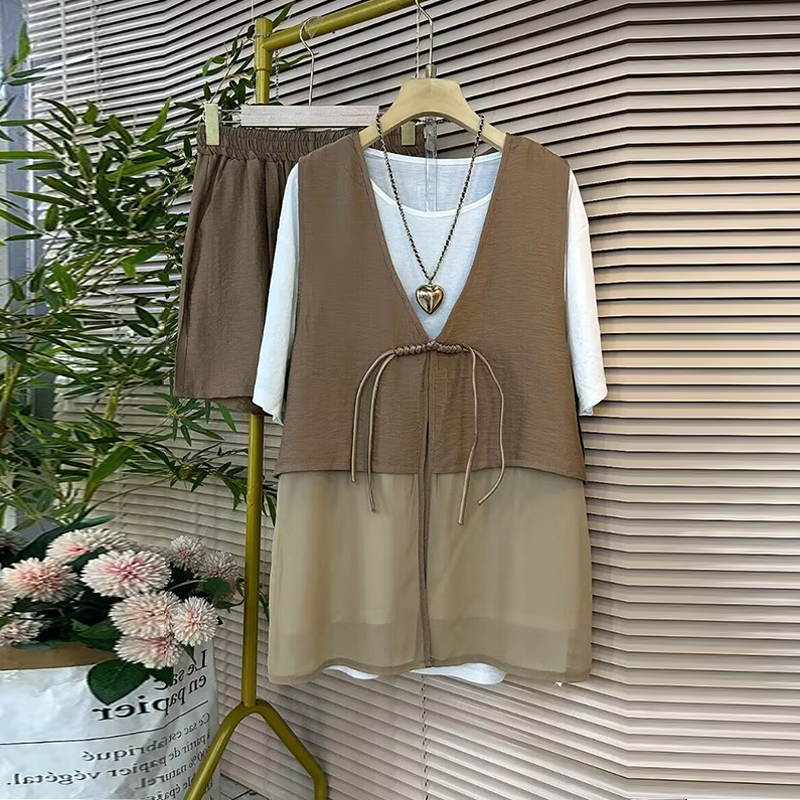 大码女装短袖打底T恤衫盘扣拼接网纱底摆马甲短裤休闲减龄三件套