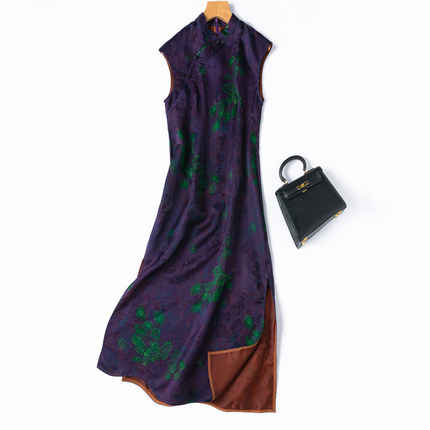 优雅神秘紫!夏季旗袍!真丝提花缎花罗香云纱立领修身连衣裙长款