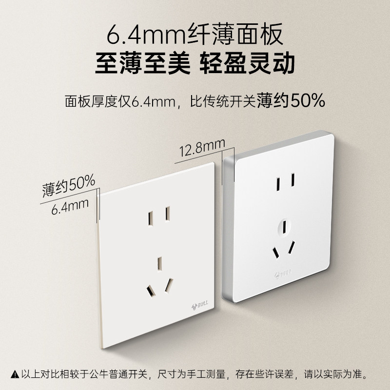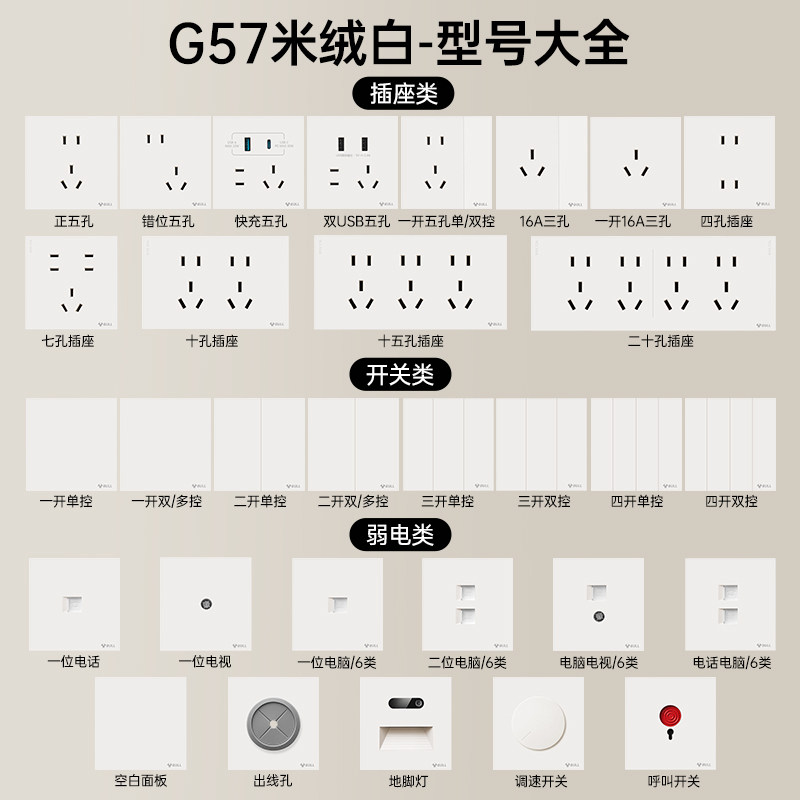 公牛G57米绒白超薄开关插座面板哑光肤感暗装G56奶油风斜五孔家用