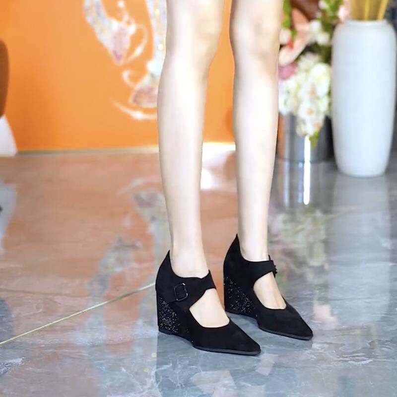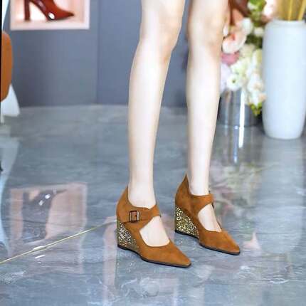 韩版百搭时尚坡跟8cm高跟鞋女2025秋季新款尖头浅口舒适平底单鞋