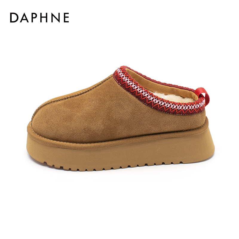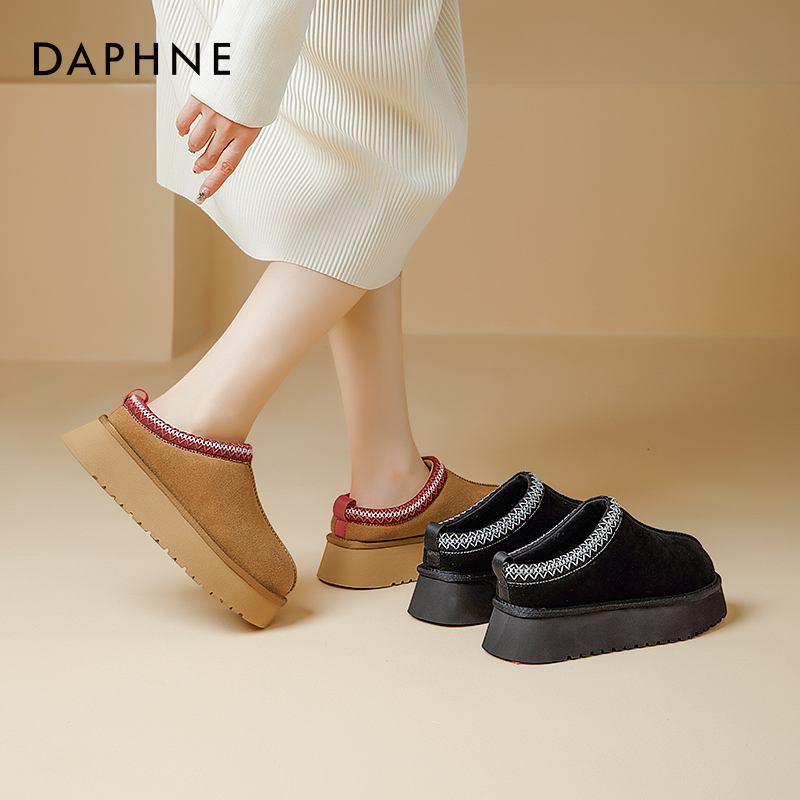 达芙妮厚底雪地靴女款半拖2025新款冬季真皮增高短筒加绒加厚棉鞋