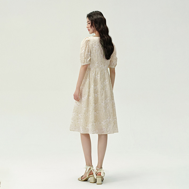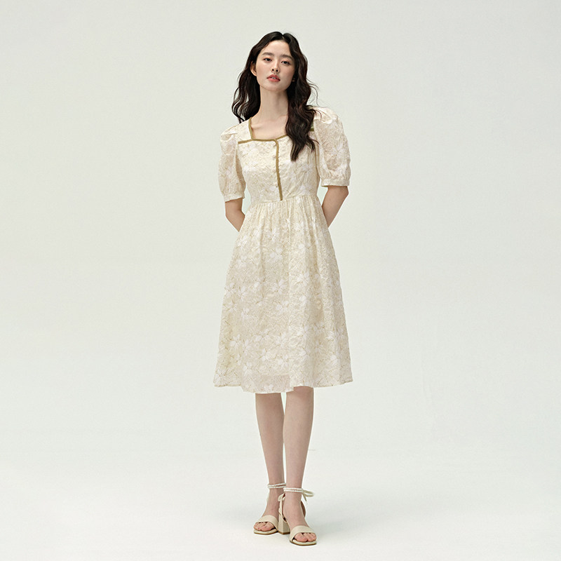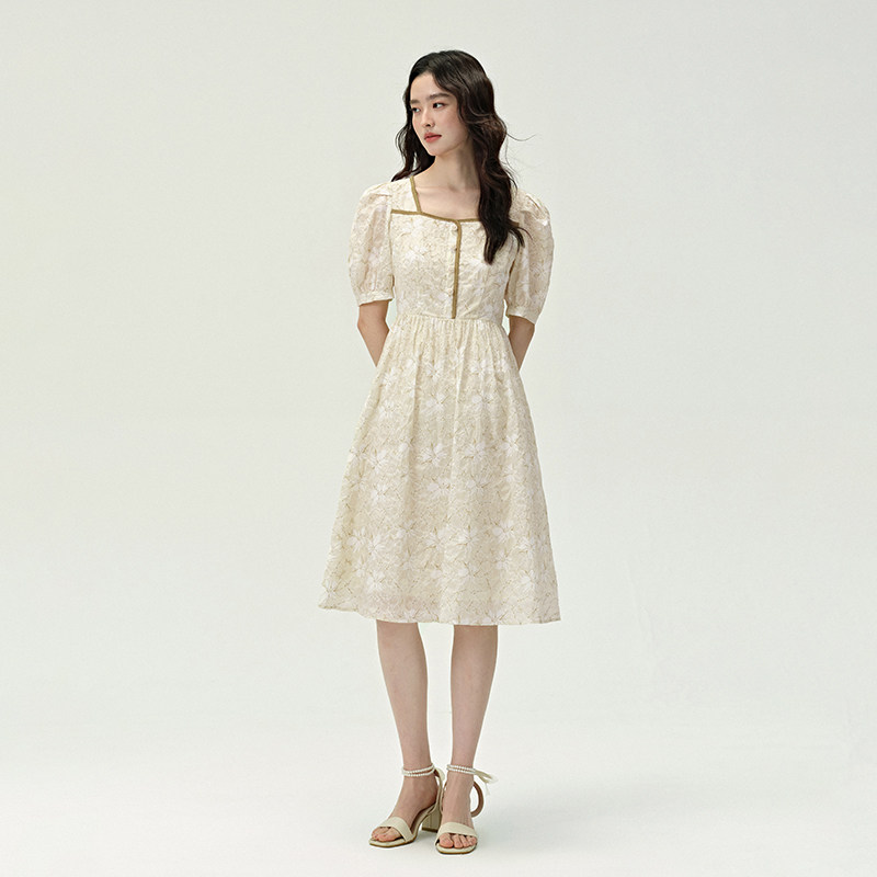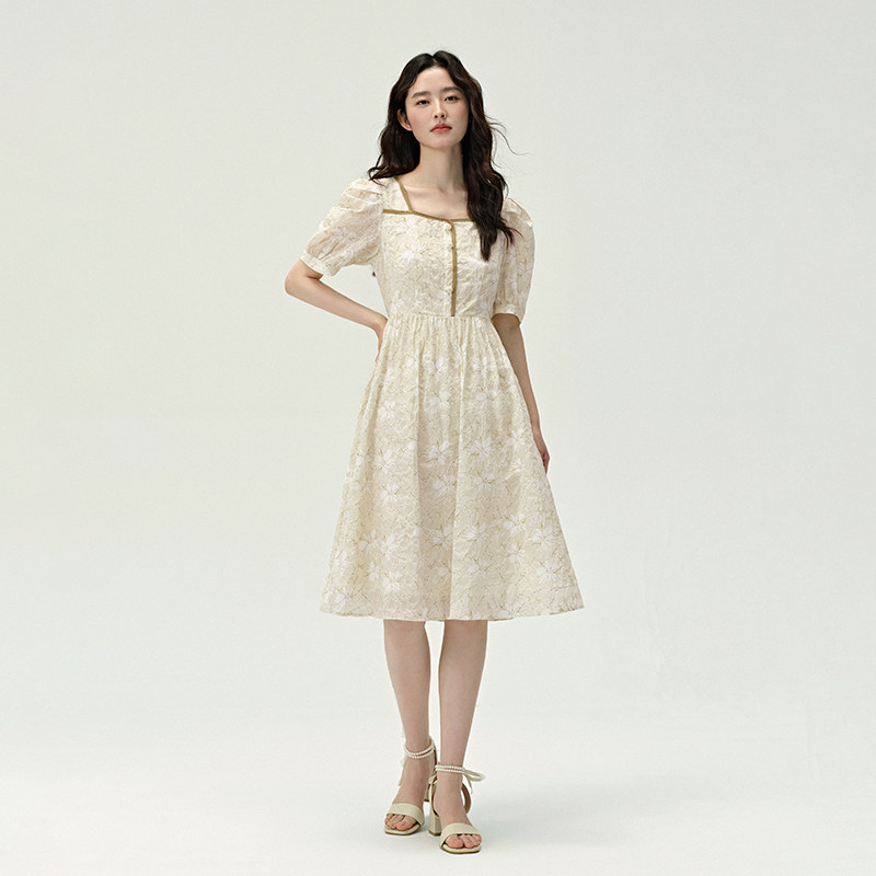 PIT复古纯棉方领收腰荷叶边A字碎花连衣裙女2025夏淑女透气中长裙