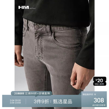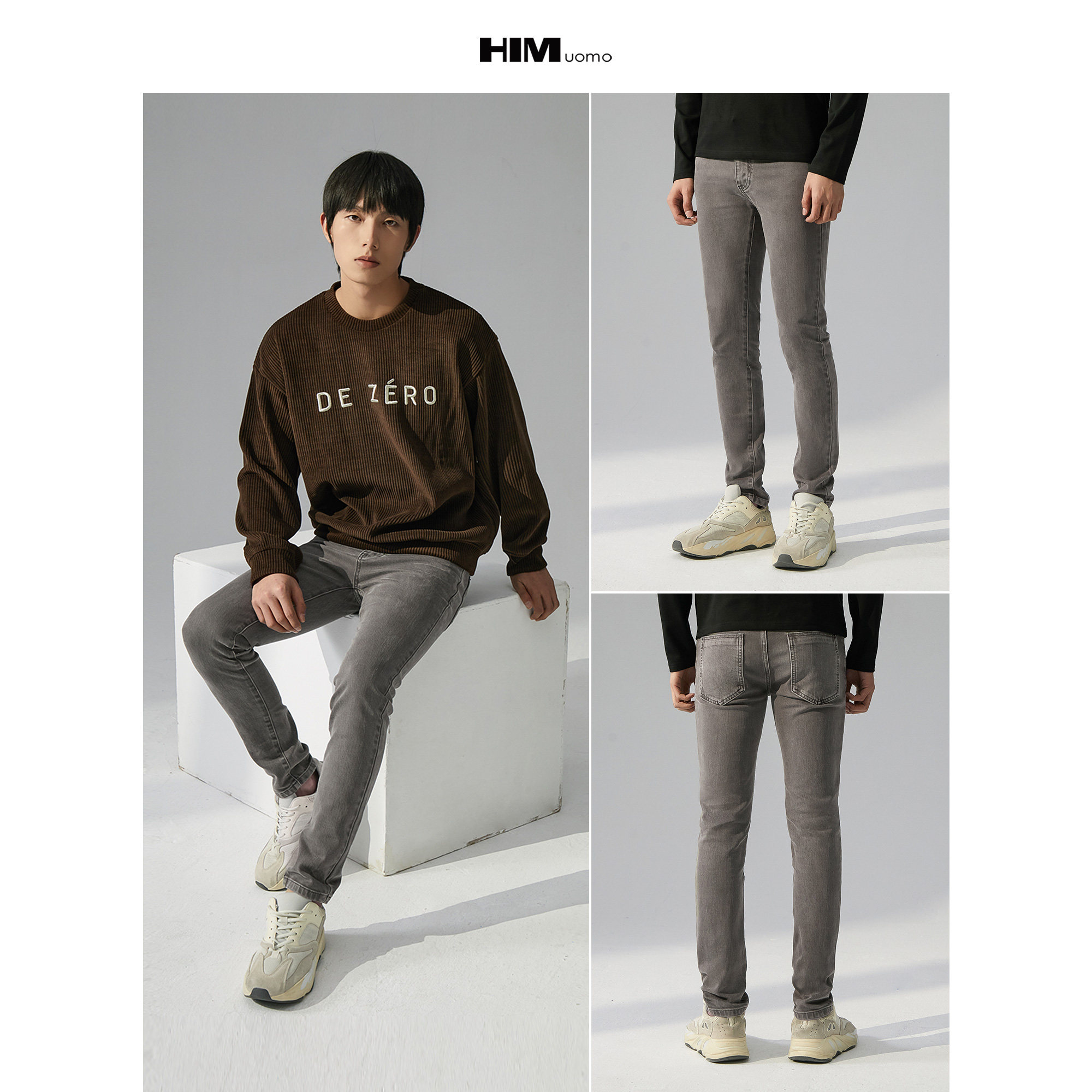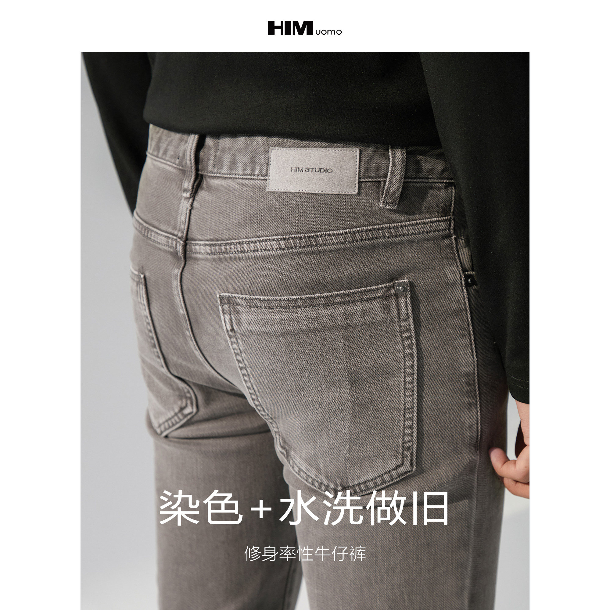 HIM汉崇 染色水洗做旧紧身牛仔裤男咖啡色修身弹力小脚裤2025冬季