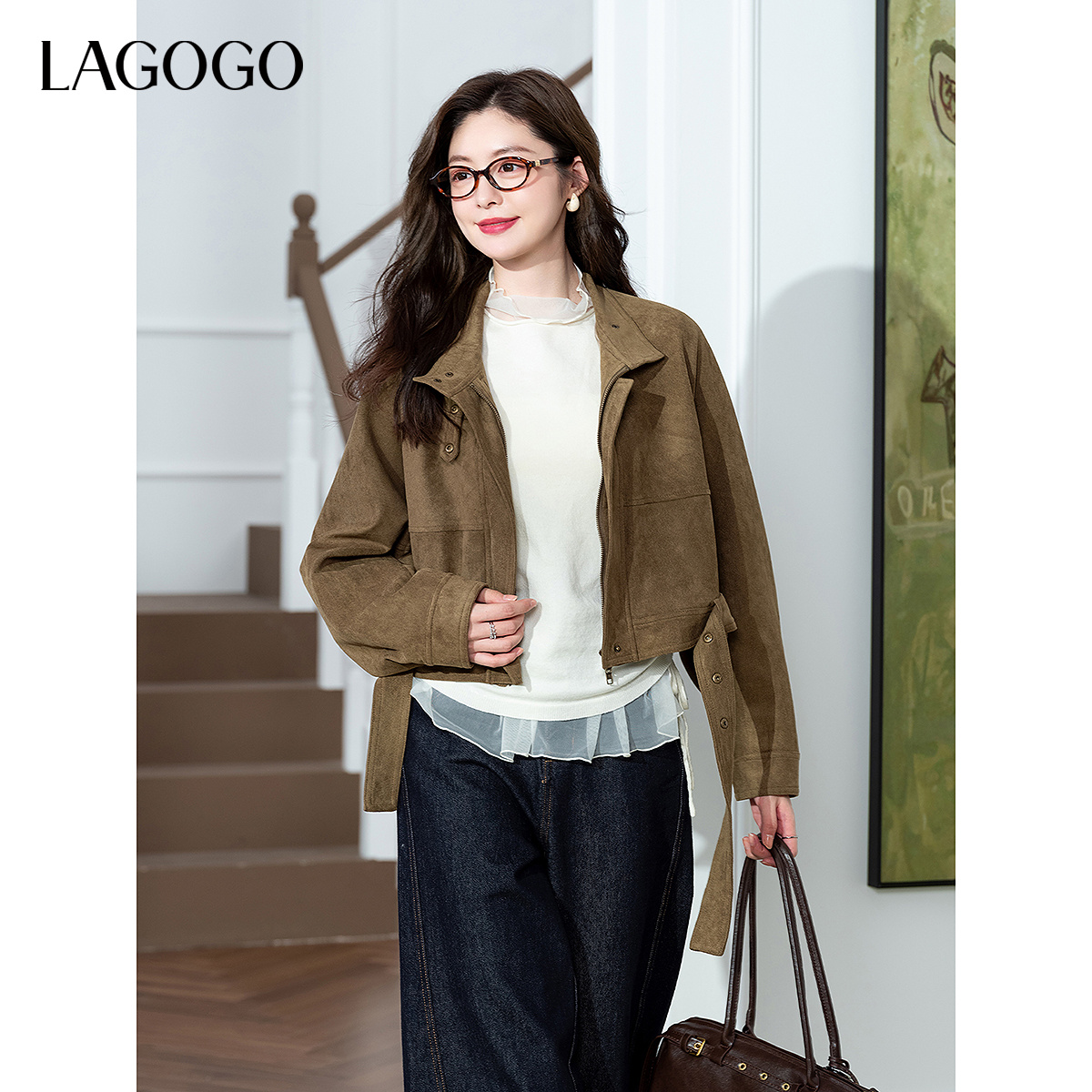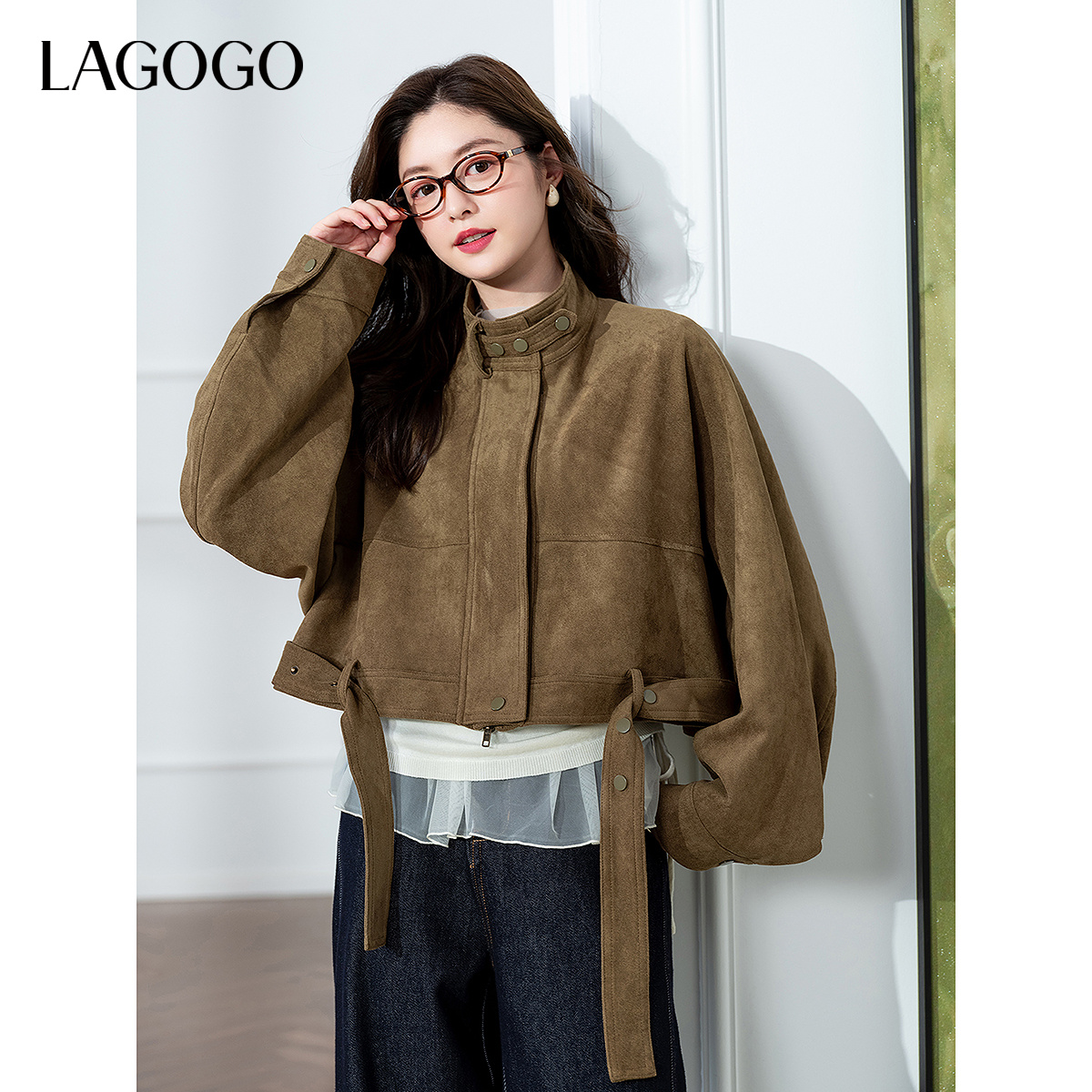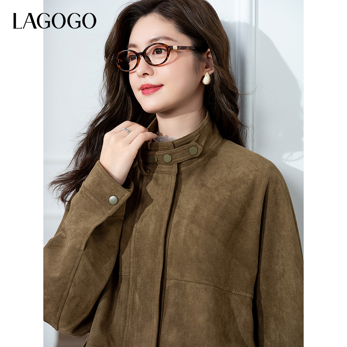 LAGOGO麂皮绒琥珀流光风外套女拉谷谷2025秋冬新款军绿色蝙蝠袖夹