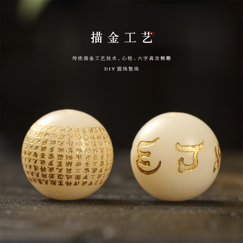 天然白玉菩提根DIY烫金描金六字真言心经工艺配件单珠20mm大圆珠