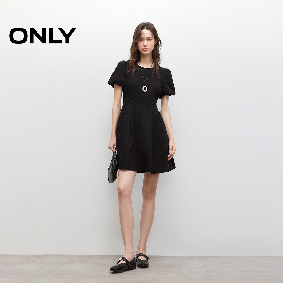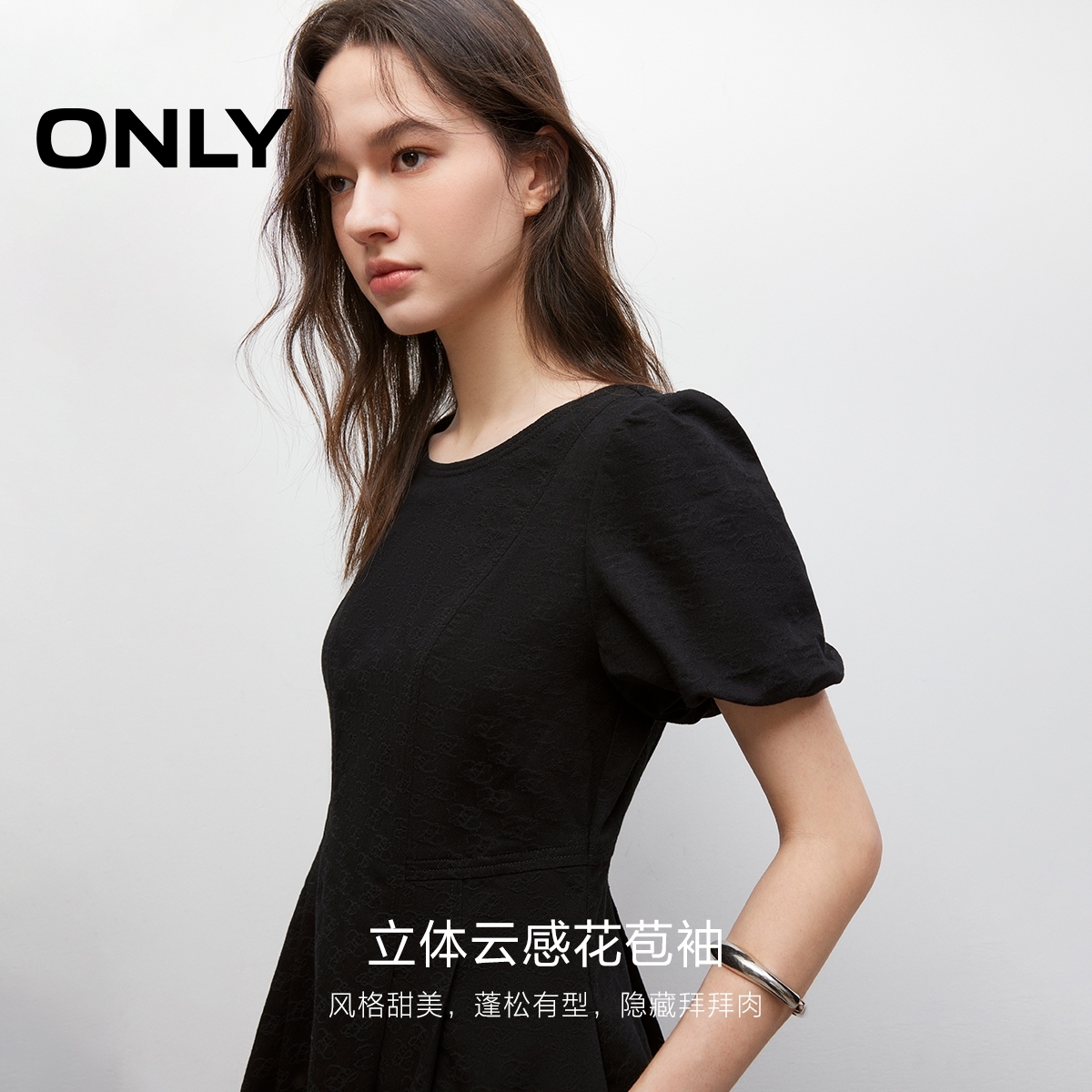 ONLY2025夏季新款质感暗纹满印花苞袖收腰牛仔连衣裙女|125342013