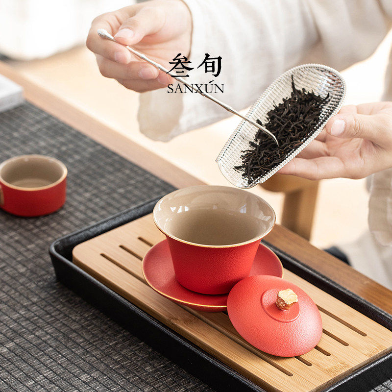 叁旬宫廷红三才盖碗茶杯陶瓷家用防烫功夫茶具单个泡茶碗大号描金
