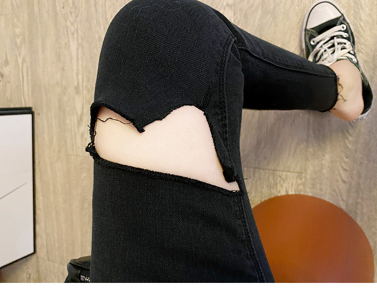 黑色破洞牛仔裤女潮ins高腰8分小个子宽松显瘦韩国紧身九分薄款