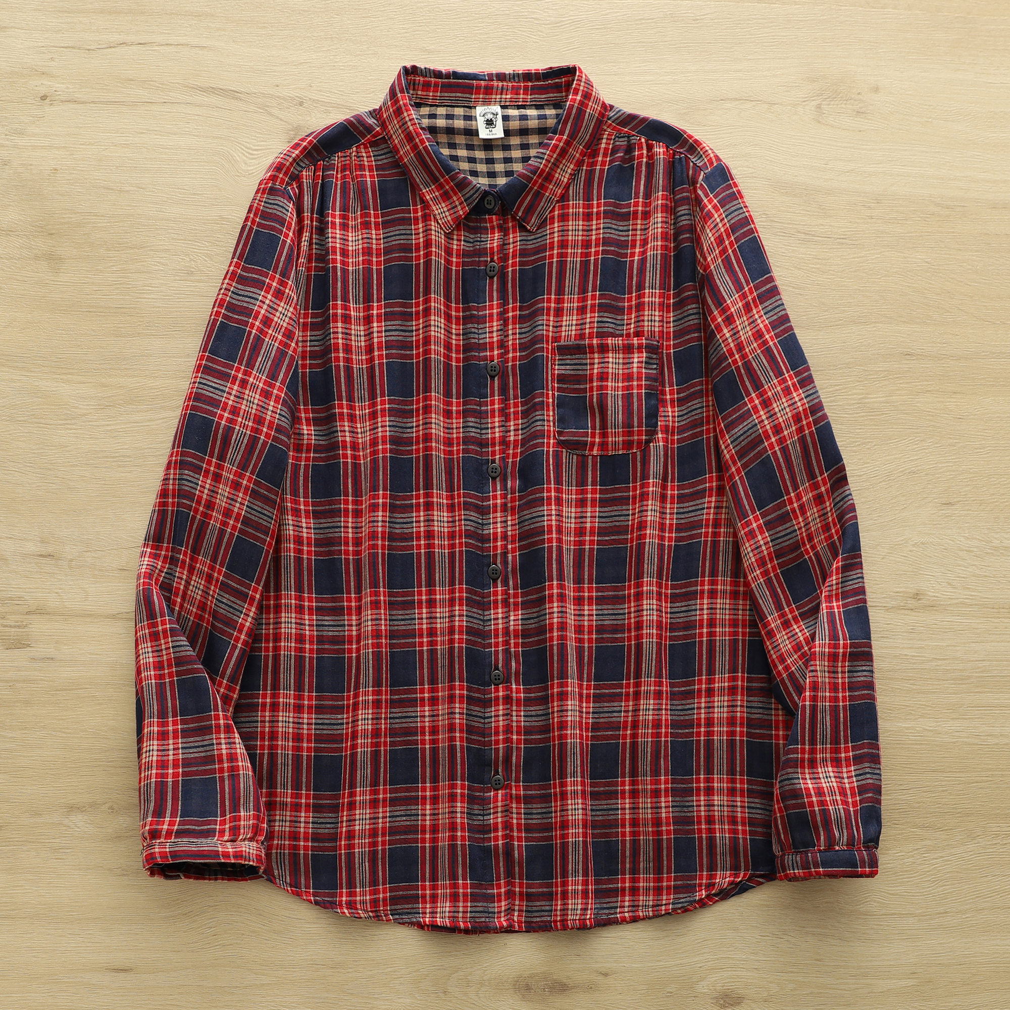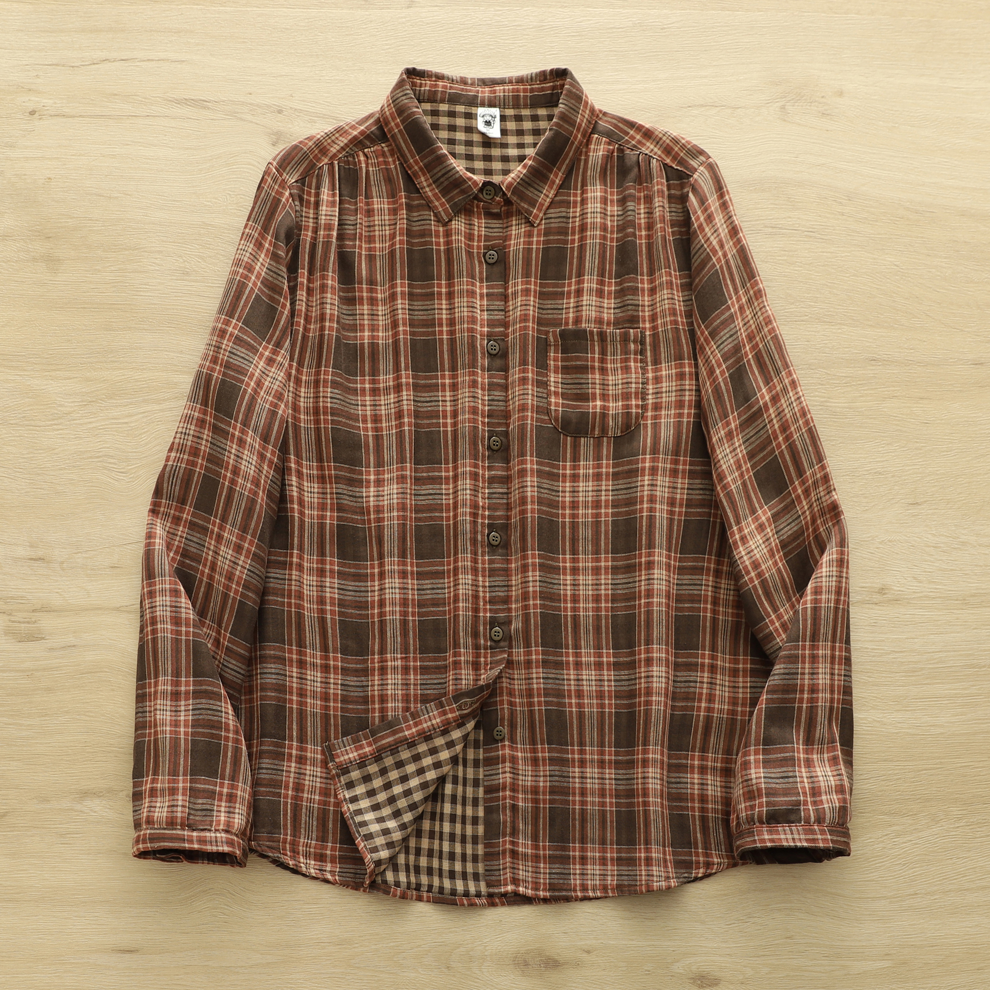 双层棉纱格子衬衫女宽松2025秋季新款复古纯翻领纯棉柔软长袖衬衣