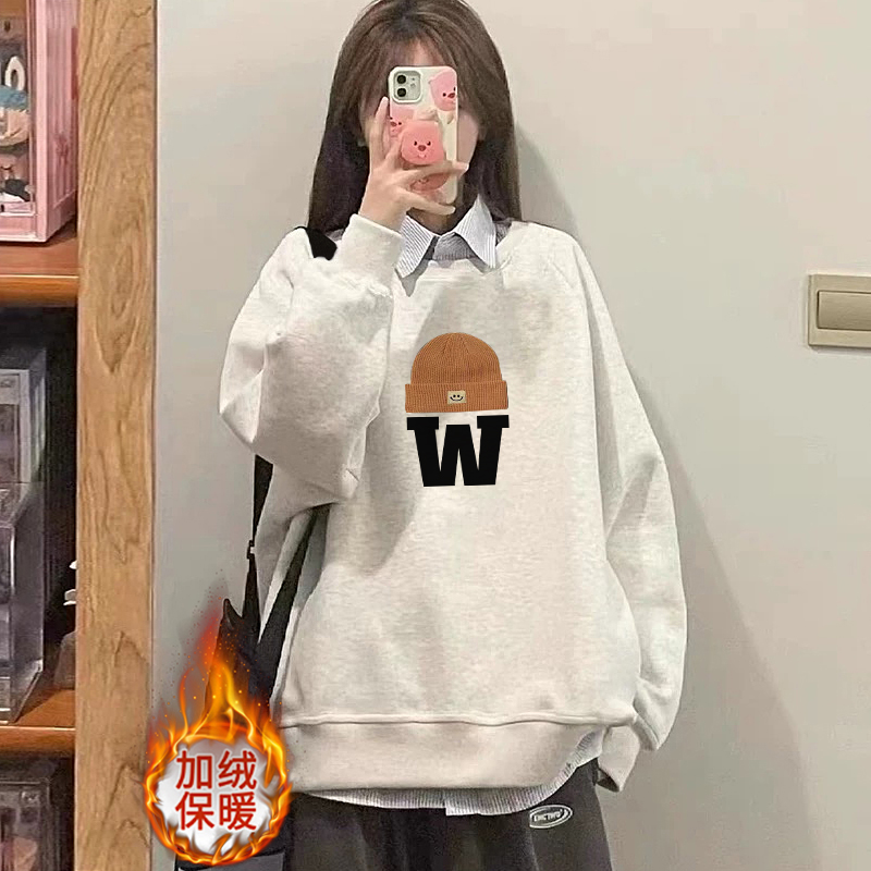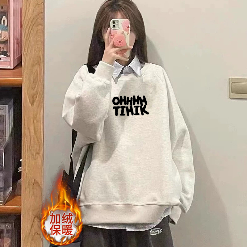 加绒加厚圆领套头无帽卫衣女秋冬2025爆款时尚洋气新款灰色上衣