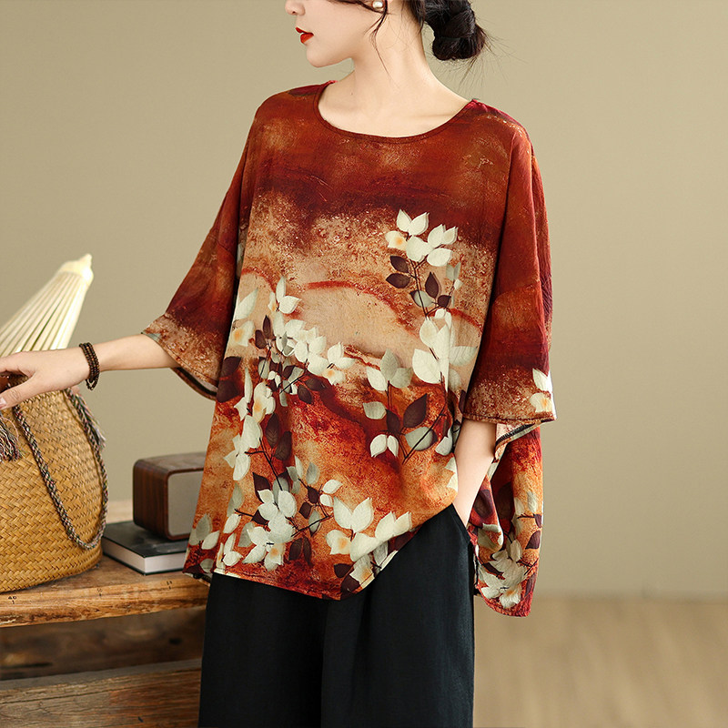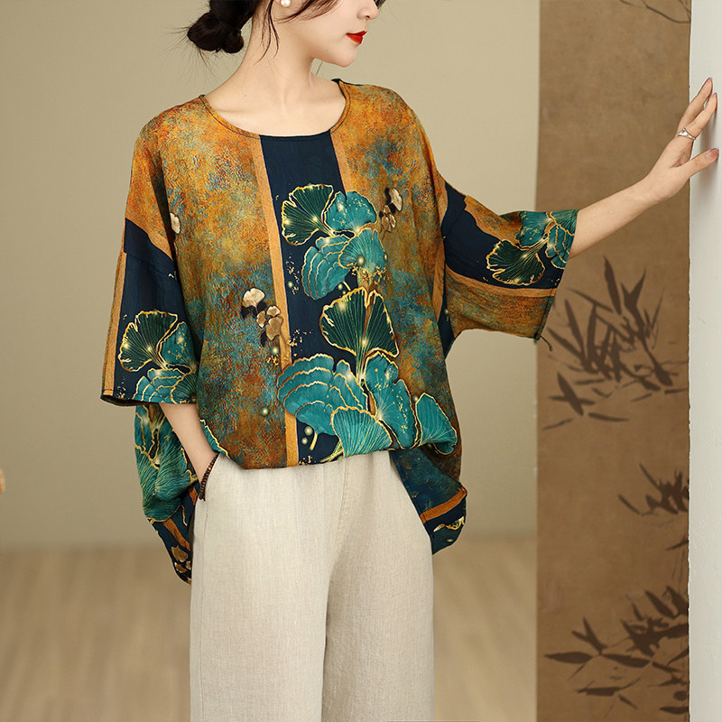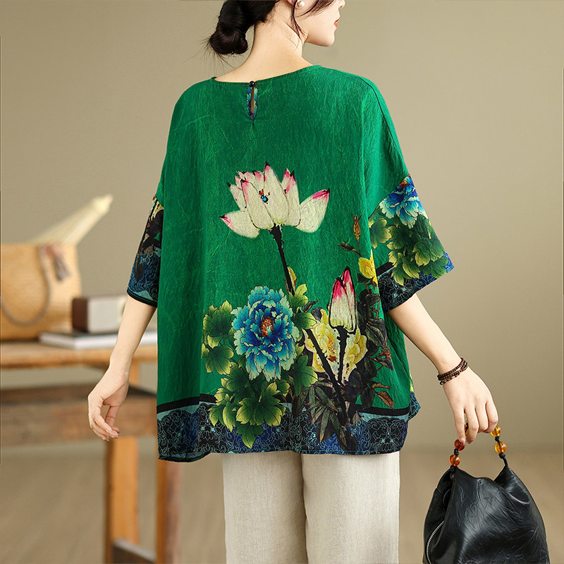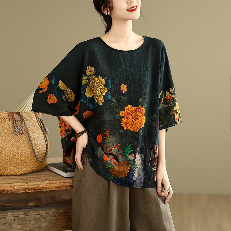 绿色花薄款蝙蝠袖 夏季新品麻棉民族风蝙蝠袖宽松大码圆领T恤女