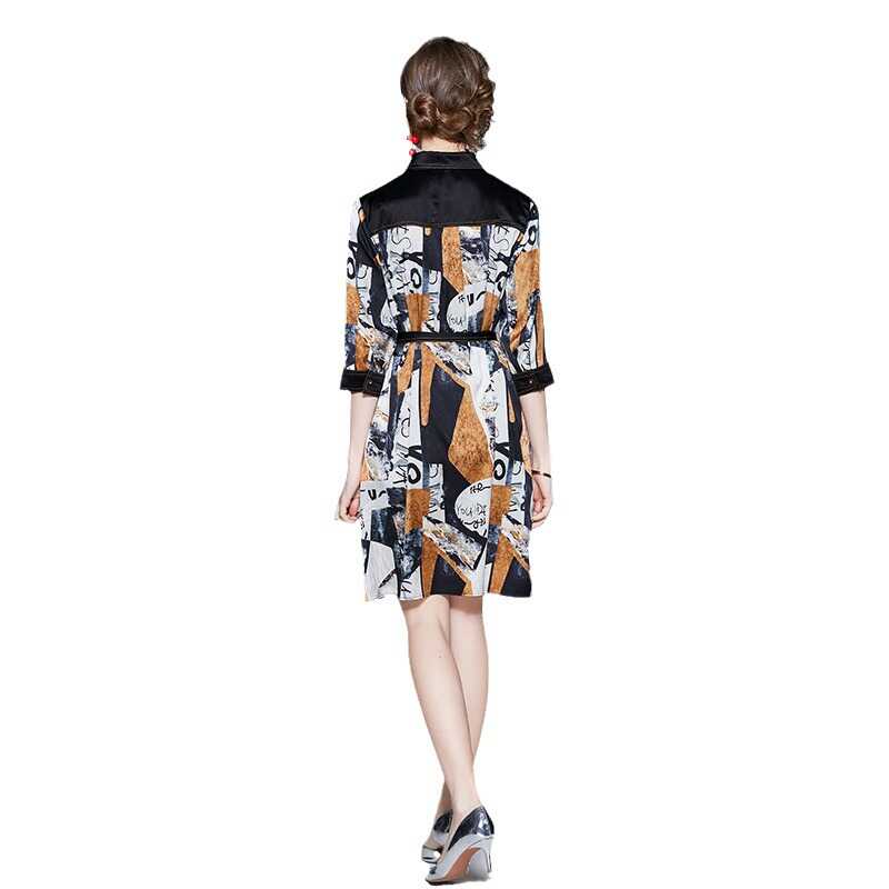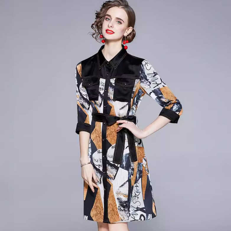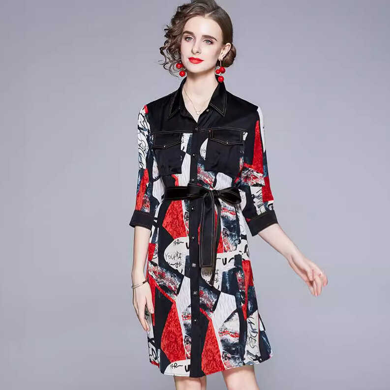 欧洲站潮牌折扣女装名媛轻奢气质时尚印花收腰单排扣衬衫裙连衣裙