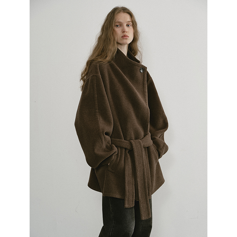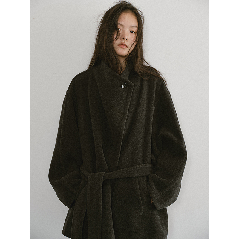 popchrio◆羊绒蚕丝松弛感低腰羊毛双面呢大衣小个子短款毛呢外套