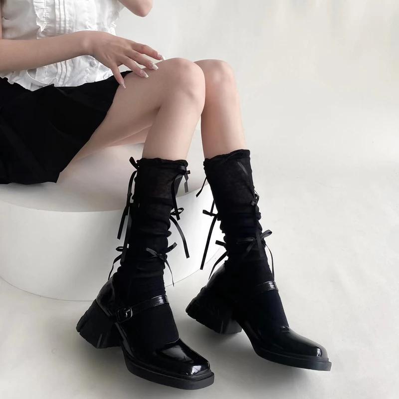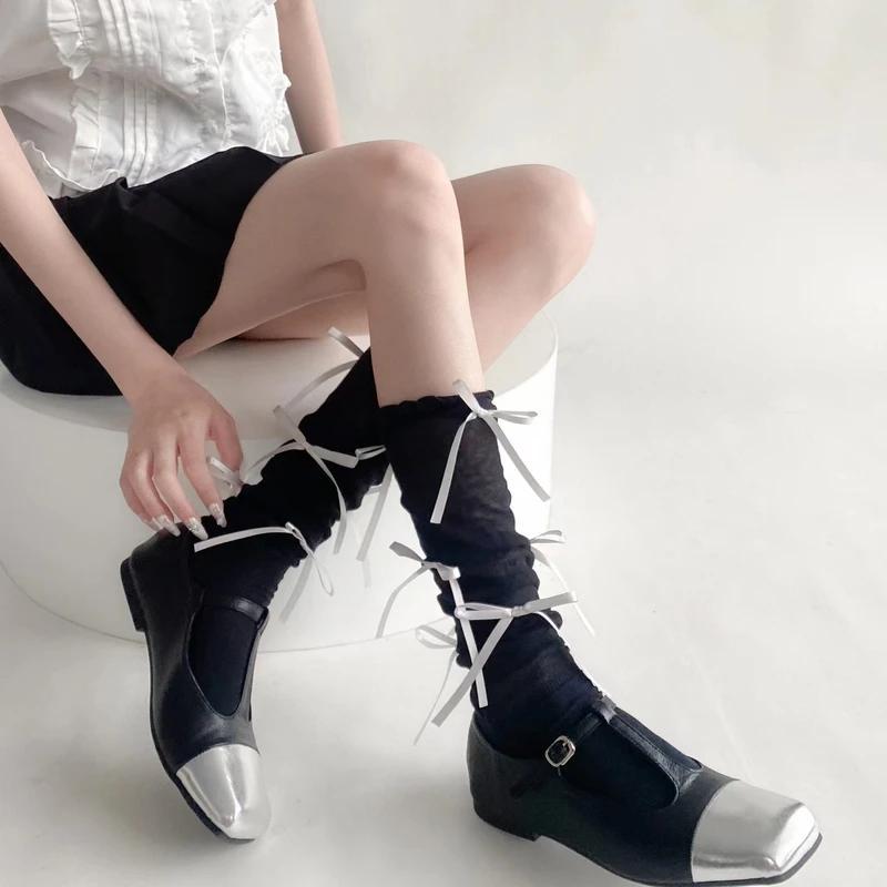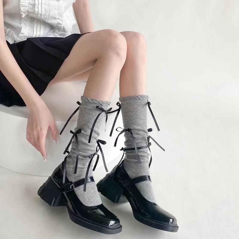 秋季新款蝴蝶结芭蕾风灰色小腿袜子女甜美风花边泡泡袜中筒堆堆袜