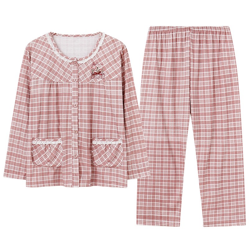 睡衣女开衫长袖春秋纯棉圆领女款无领中老年人妈妈格子全棉家居服