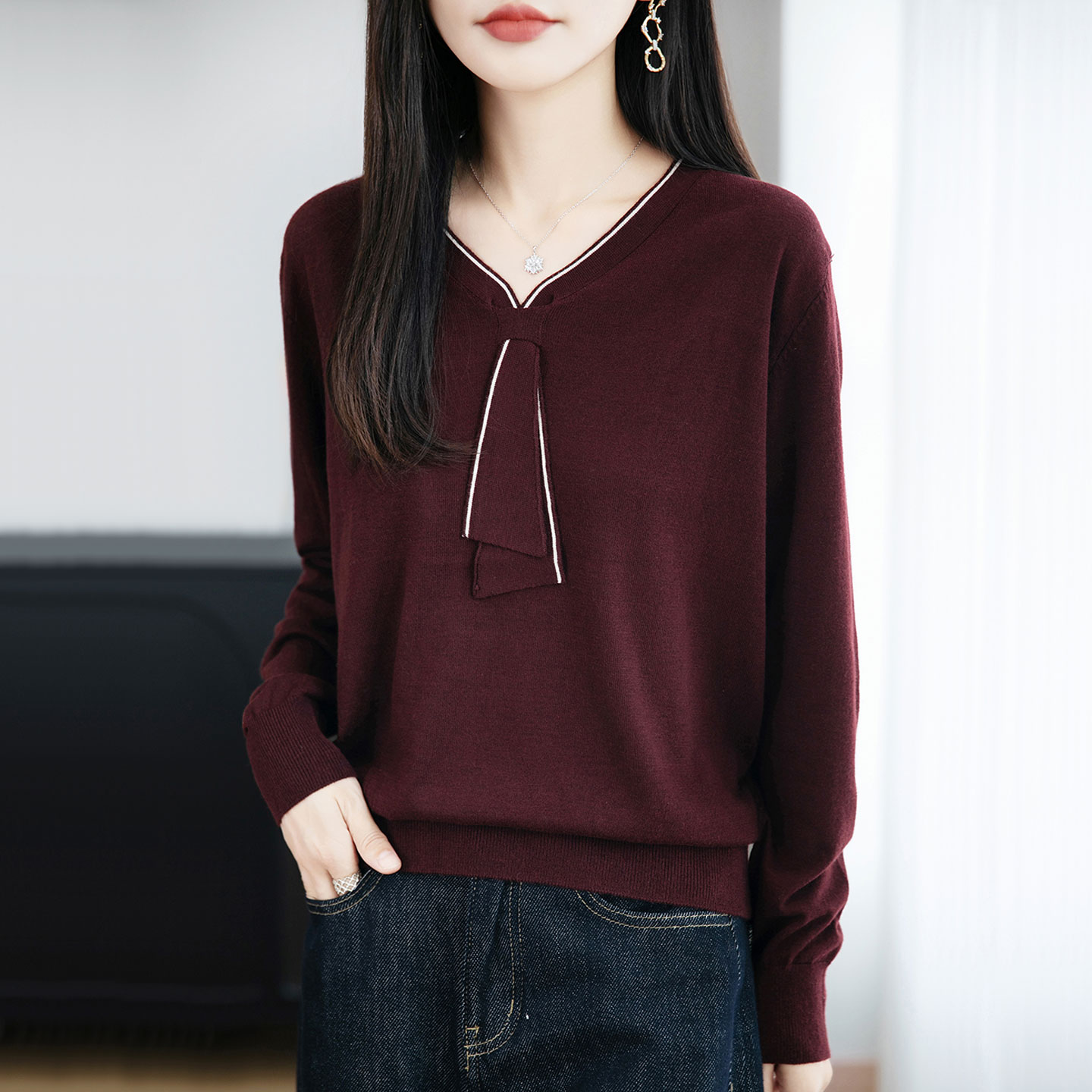 秋冬季新款拼色V领毛衫女士气质百搭显瘦针织毛衣时尚宽松打底衫