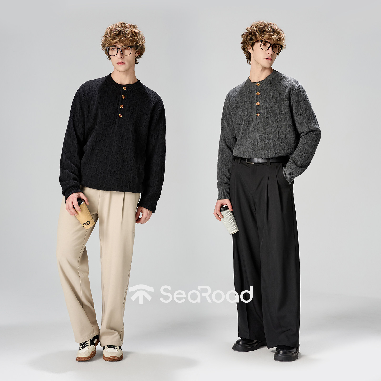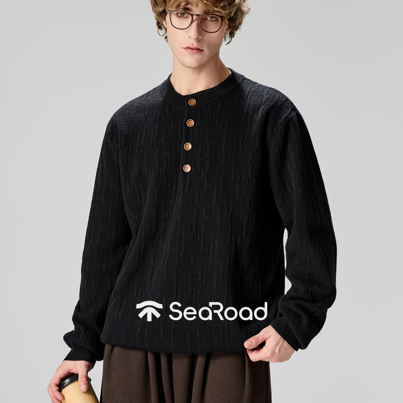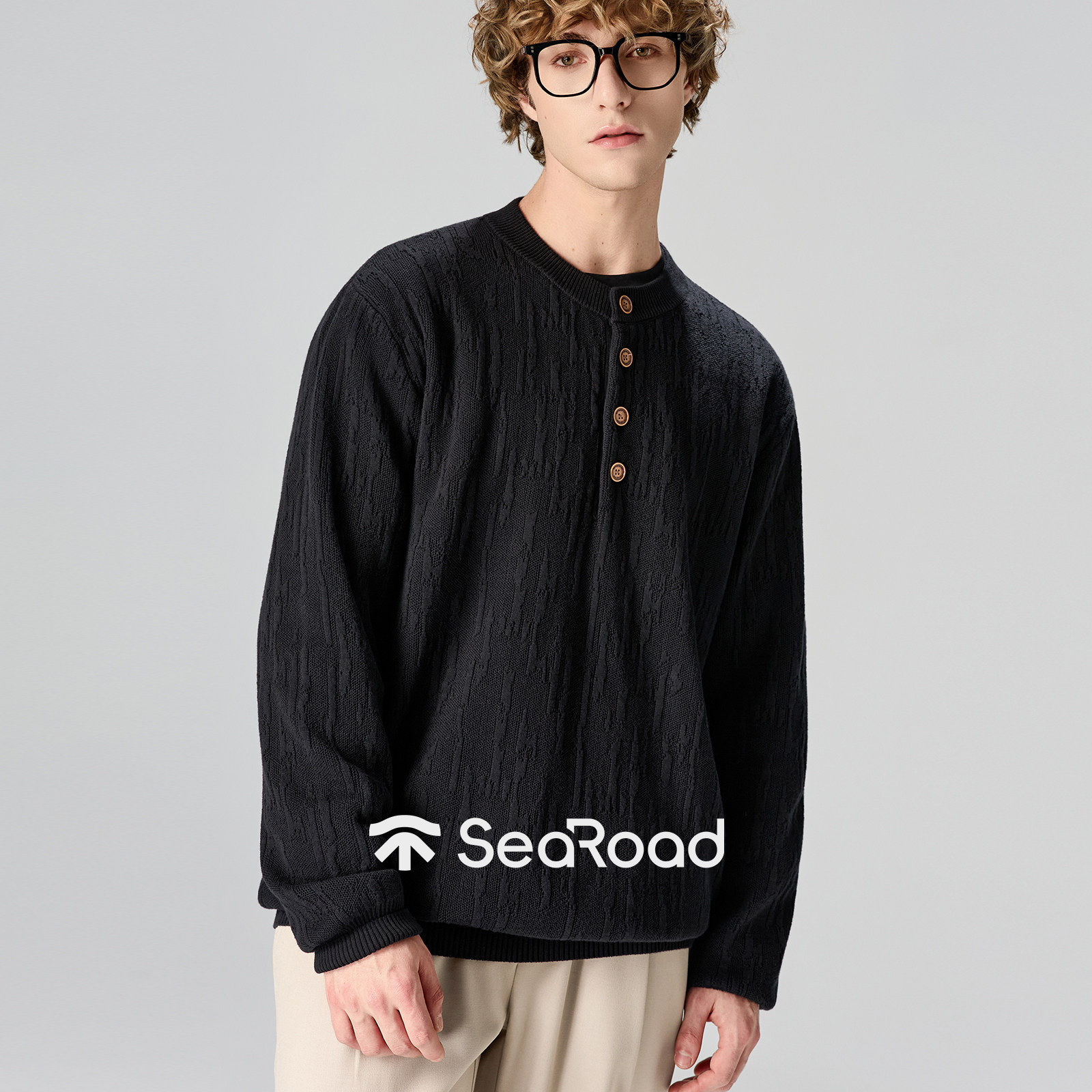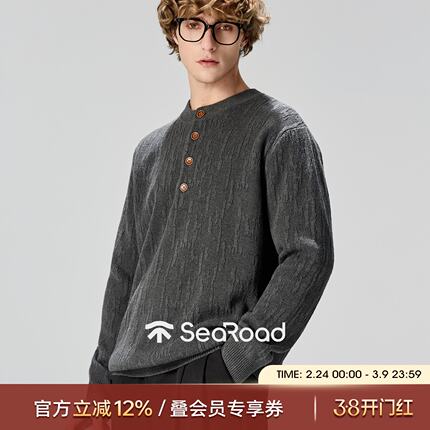 海上公路树皮纹亨利领针织衫男士26年春季100%棉高智格雷系打底衫