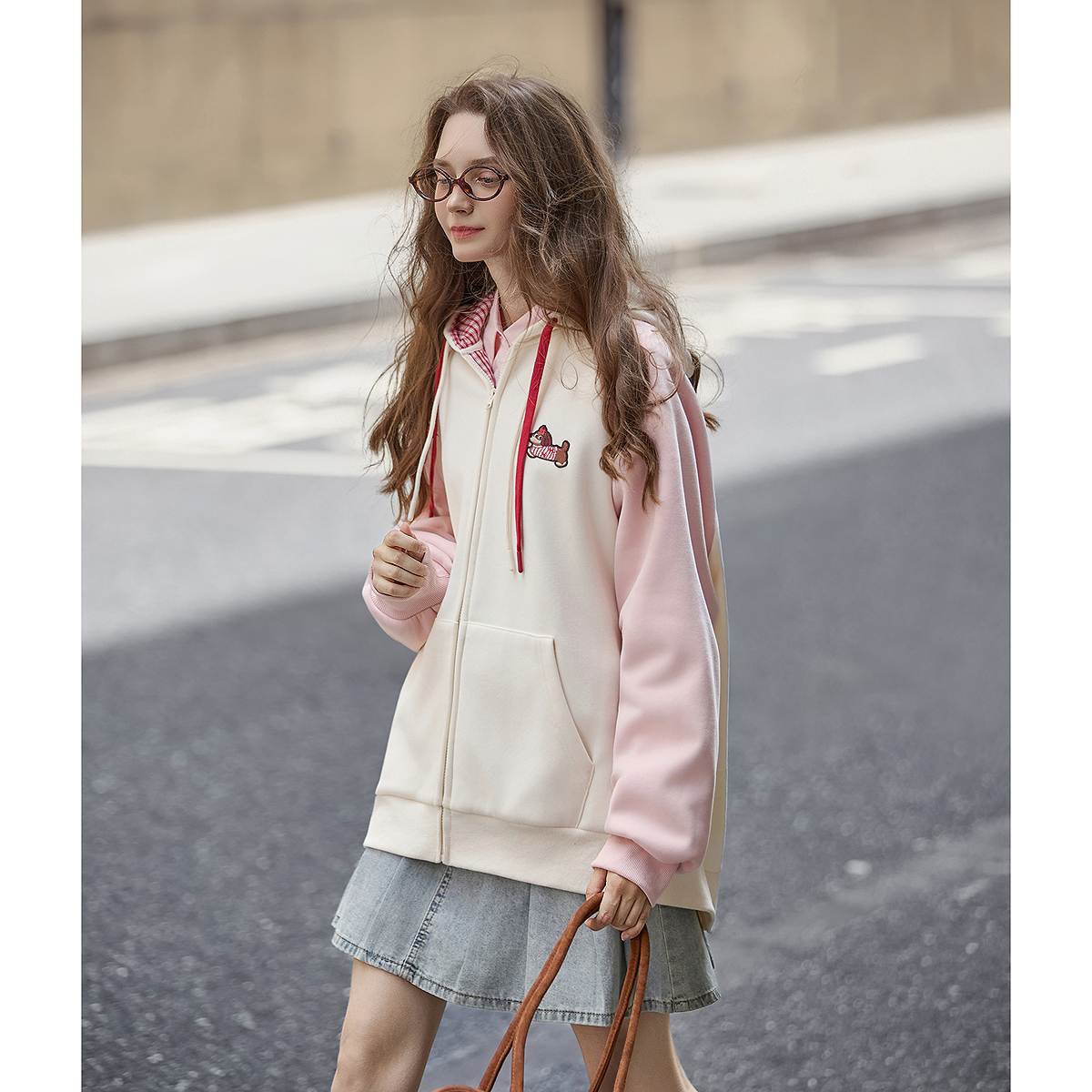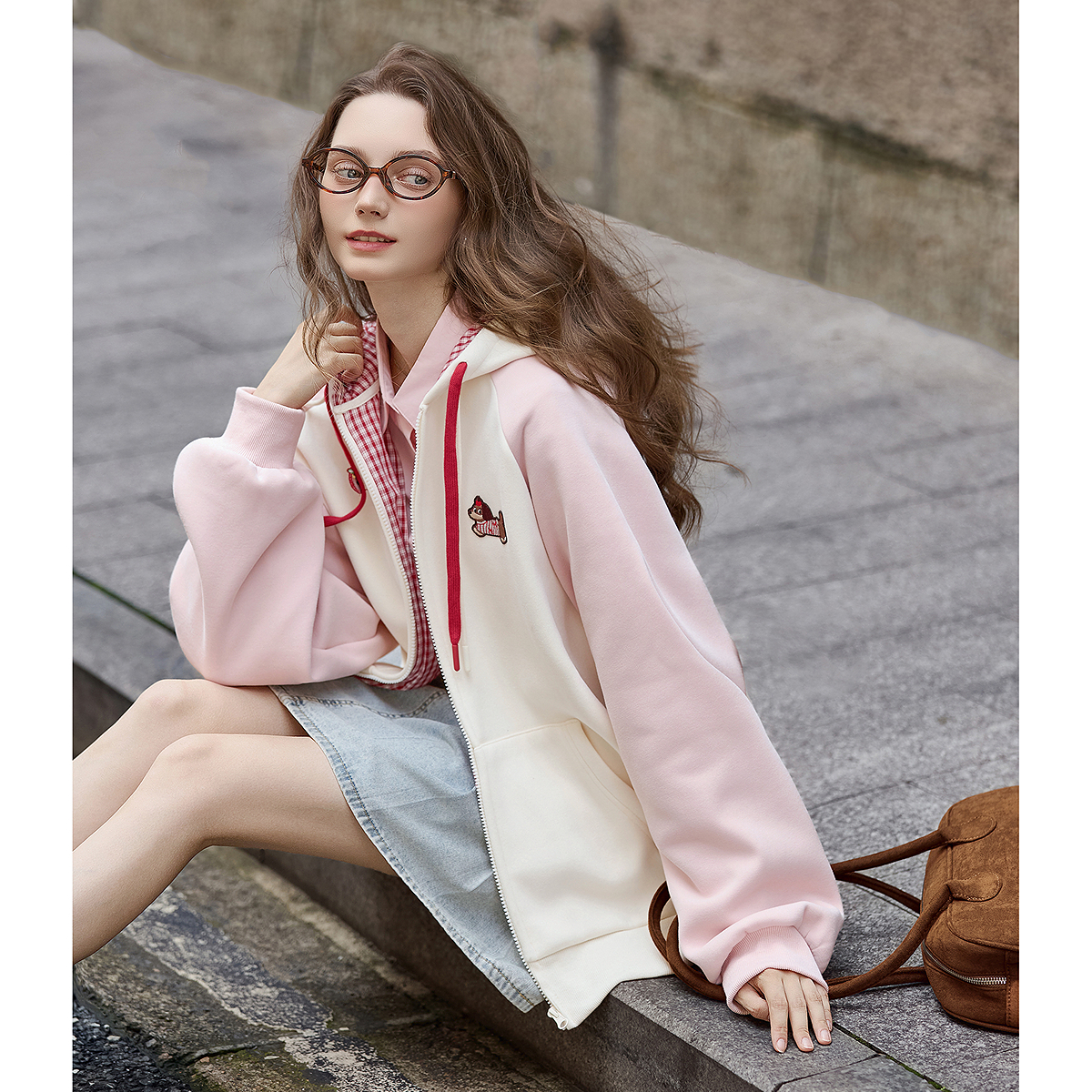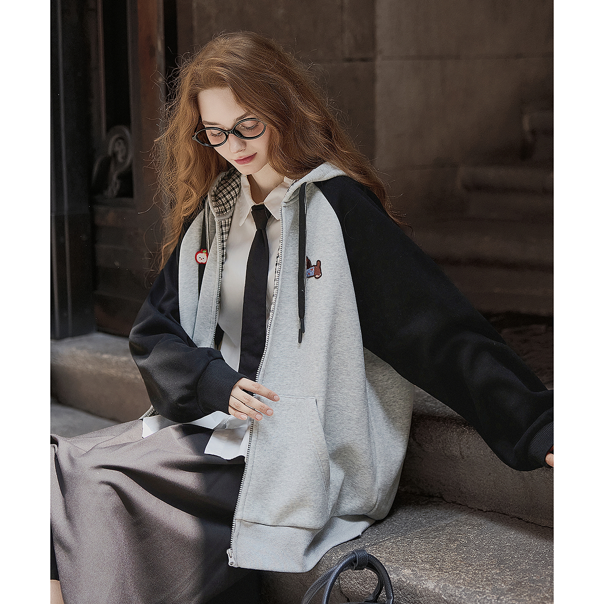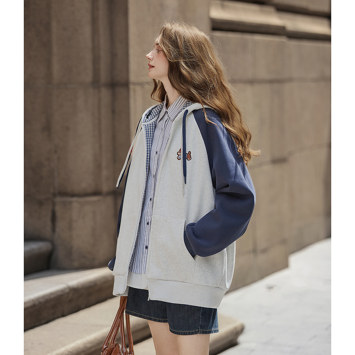 唐狮2025春秋季连帽外套女针织插肩袖撞色可爱风学生小个子外套