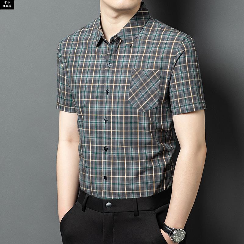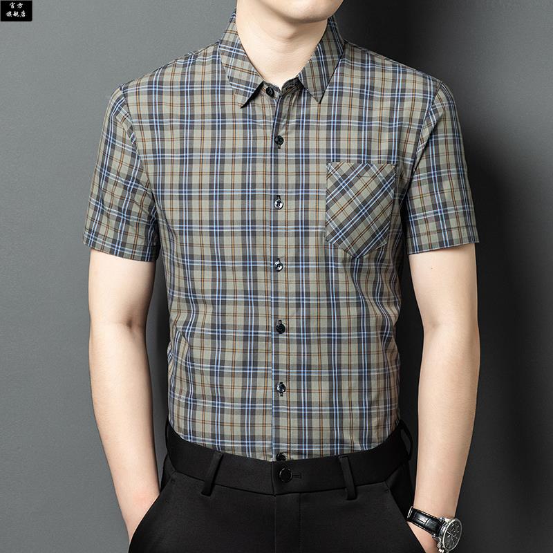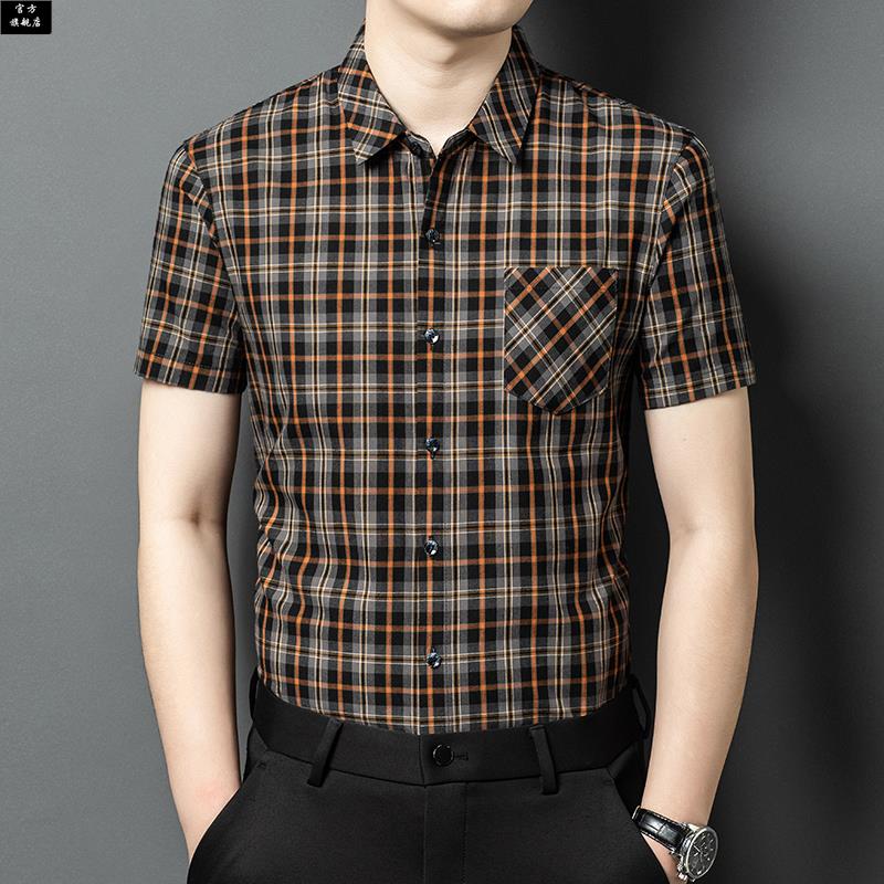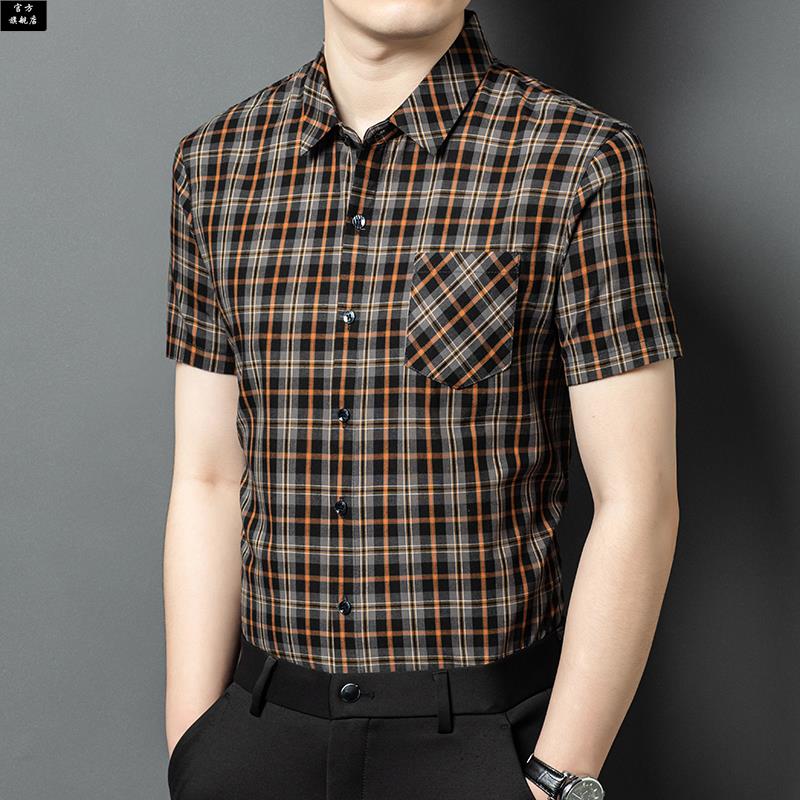 保罗官方夏季薄款冰丝短袖衬衫男格子百搭中年爸爸装口袋半袖休闲