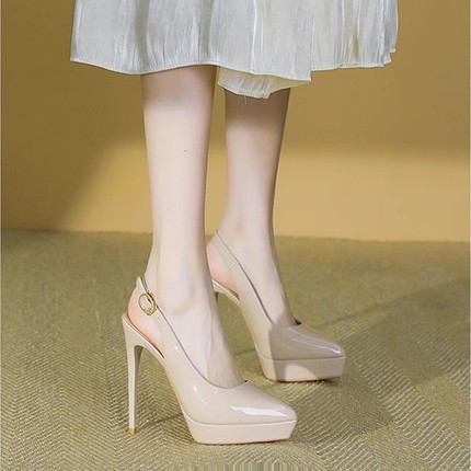 12cm包头尖头超高跟鞋防水台细跟一字扣带凉鞋女夏季性感裸色13cm