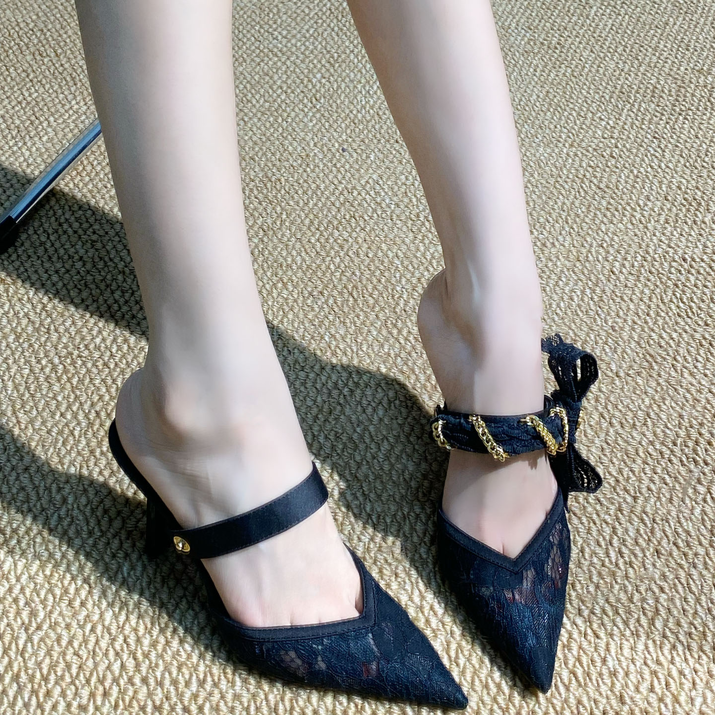 2025三穿包头凉鞋细跟尖头镂空网纱蕾丝黑色高跟鞋女性感御姐单鞋