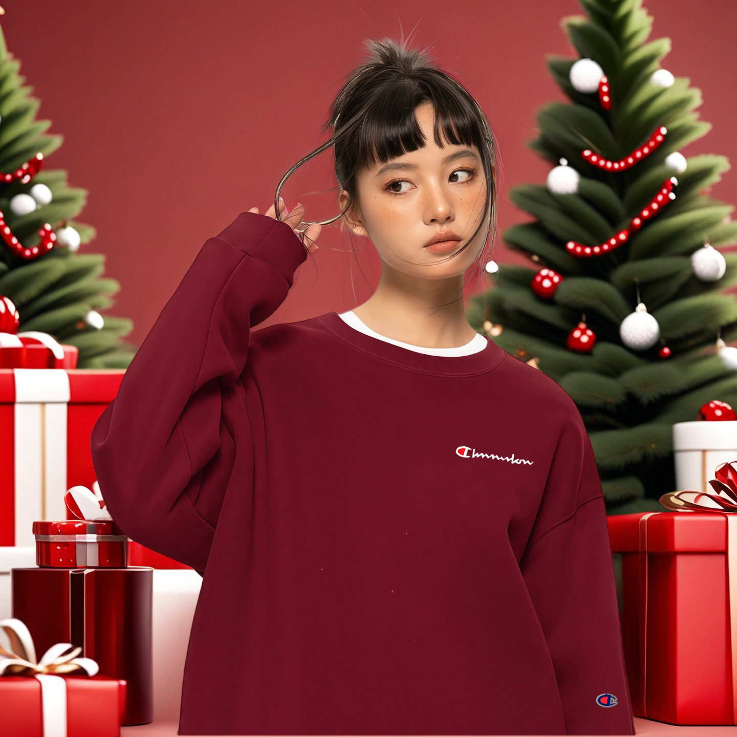 七彩冠军新年红圆领加绒卫衣女