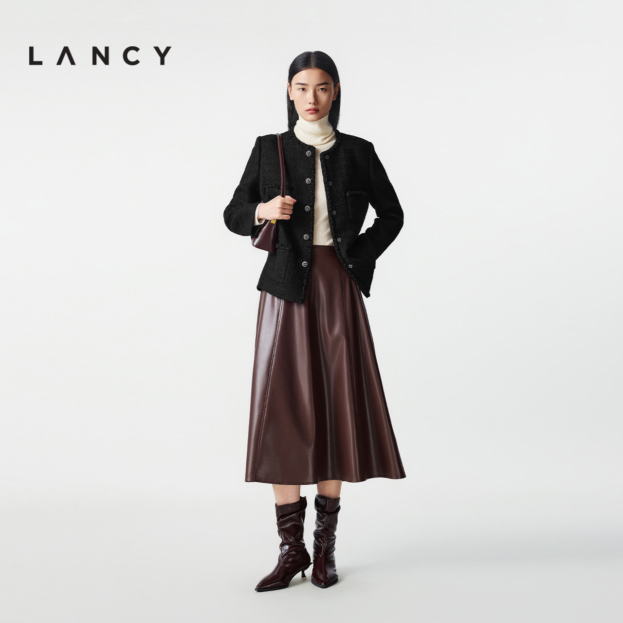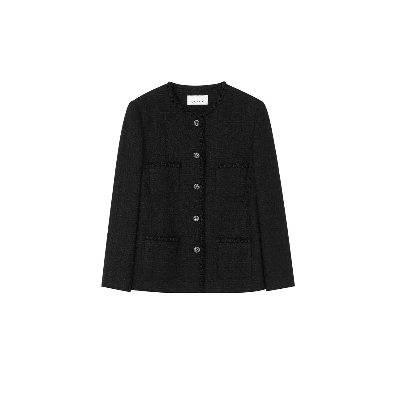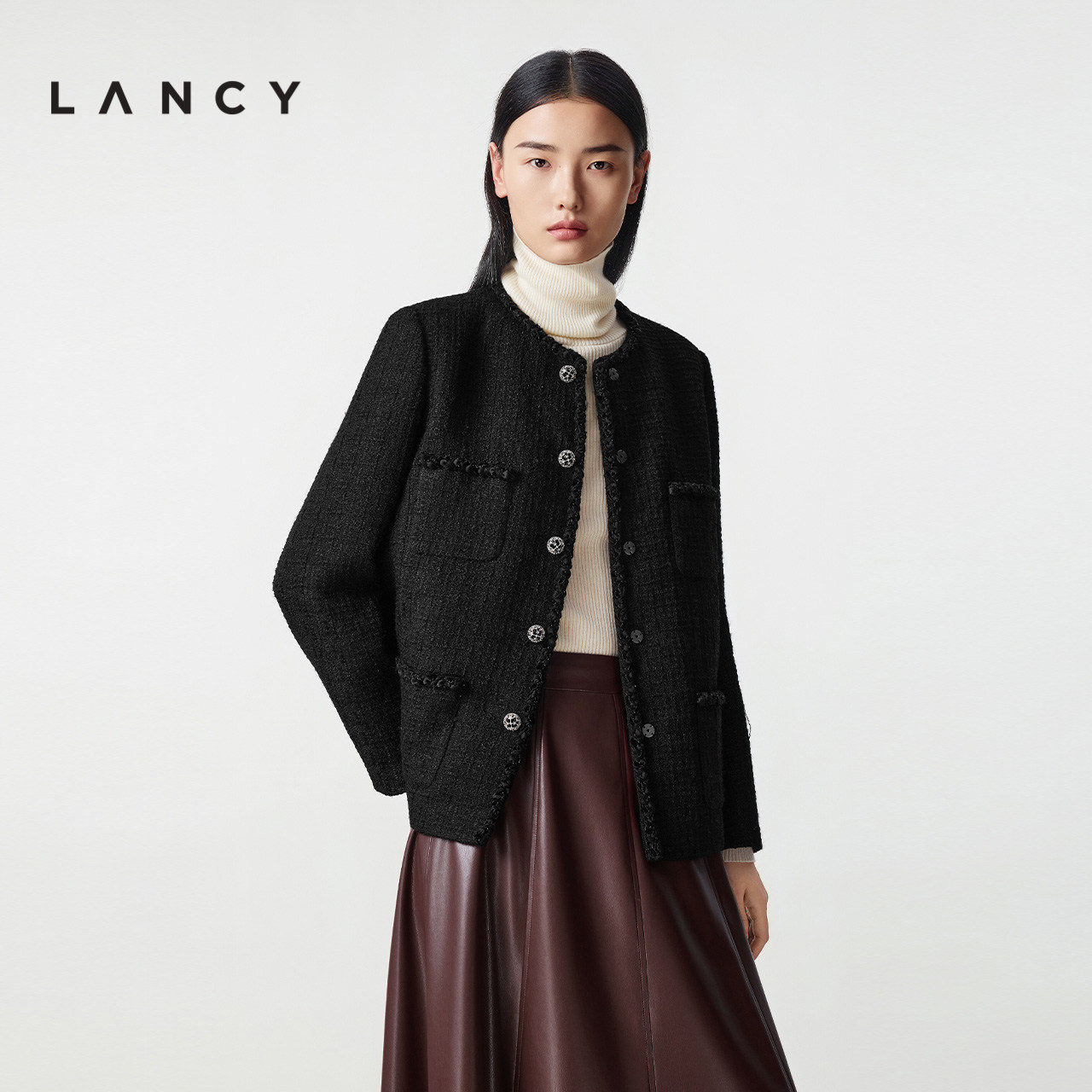 LANCY/朗姿2025冬新款法式小香风羊毛短外套气质简约黑色圆领上衣