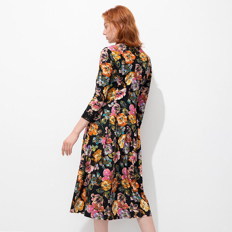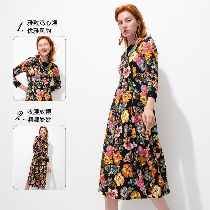 MORELINE商场同款优雅艺术印花长袖连衣裙冬装蕾丝拼接中长裙