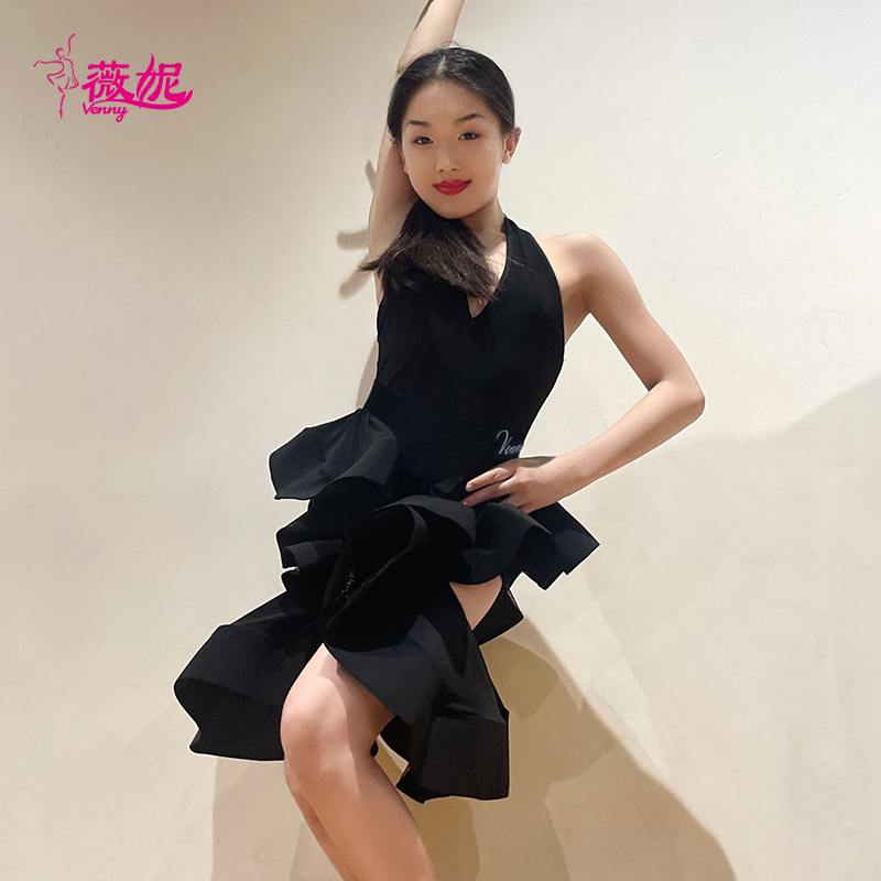 薇妮拉丁舞服挂脖无袖练功服女成人层次感国标舞大摆裙舞蹈连衣裙
