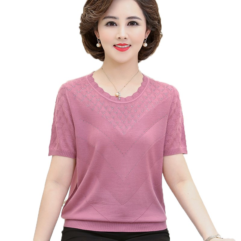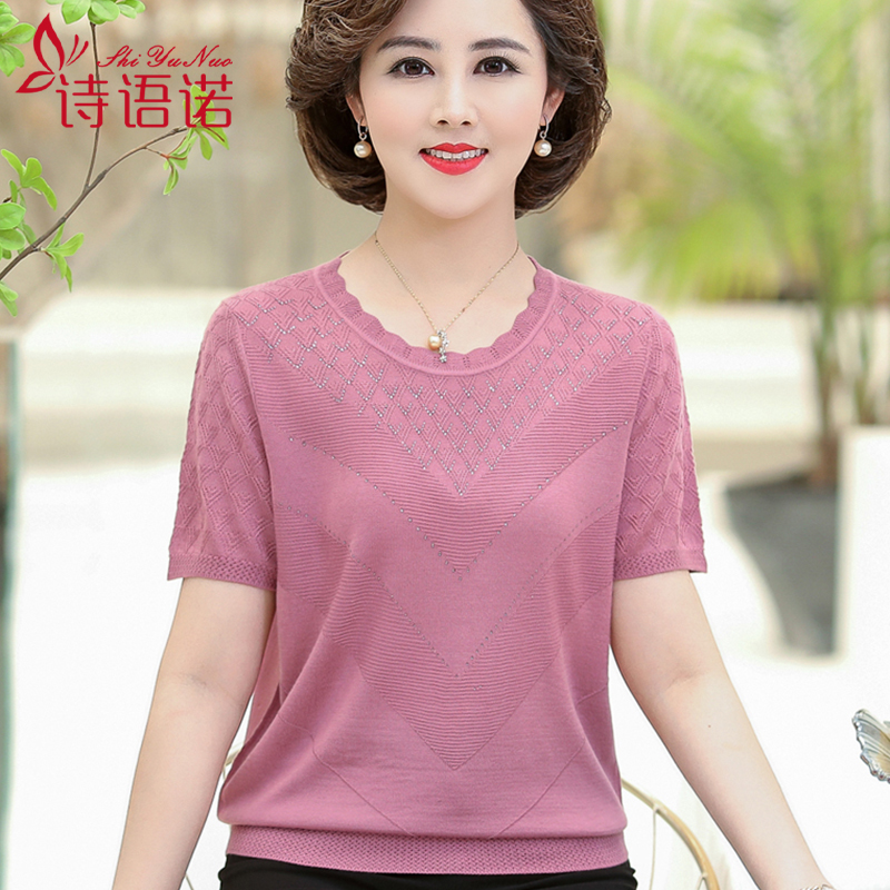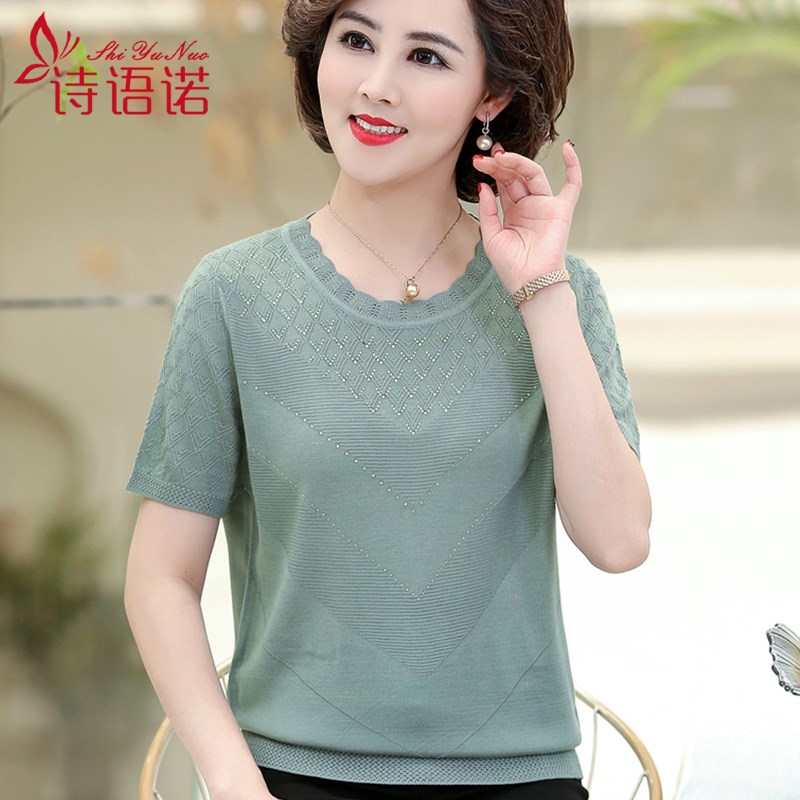 2020新款中年妇女洋气薄款t恤妈妈夏装短袖宽松大码针织打底上衣
