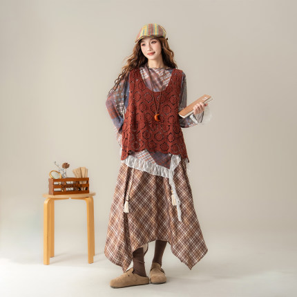 复古镂空钩花马甲背心女秋季新款不规则蕾丝拼接T恤半身长裙套装