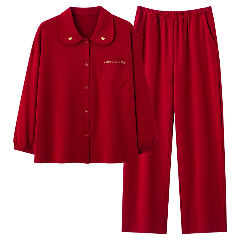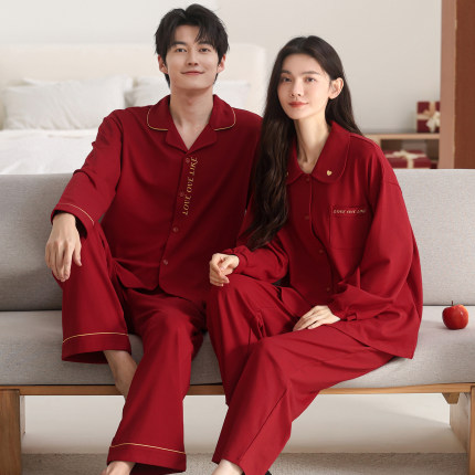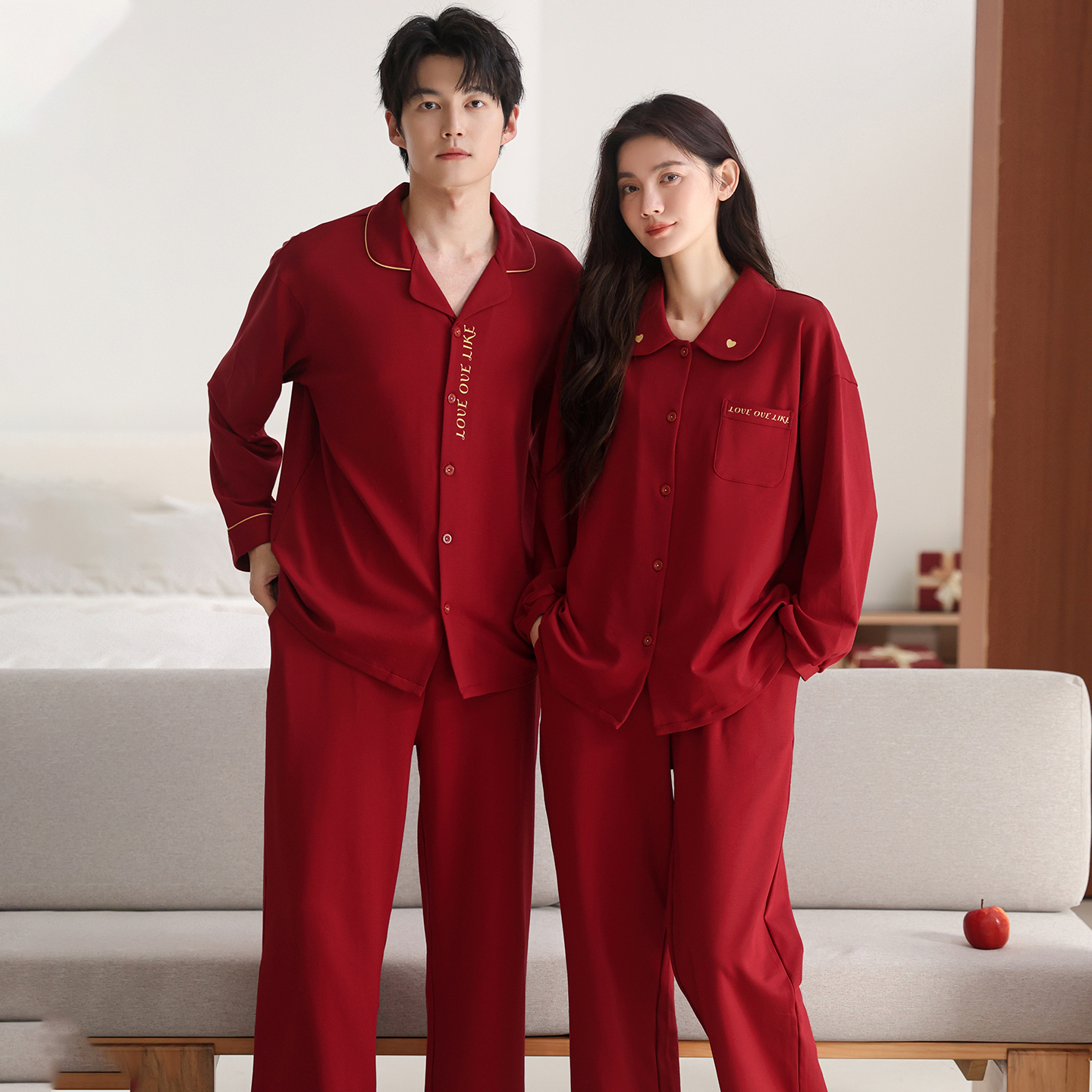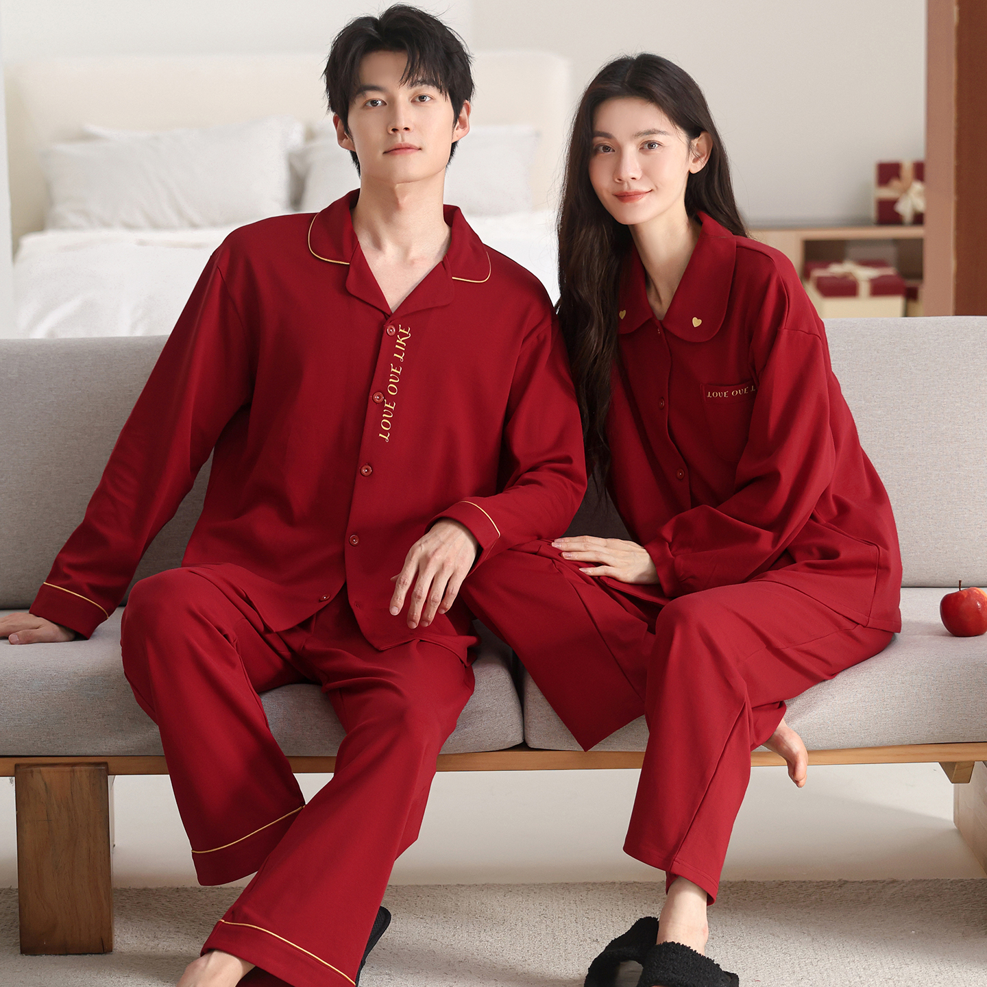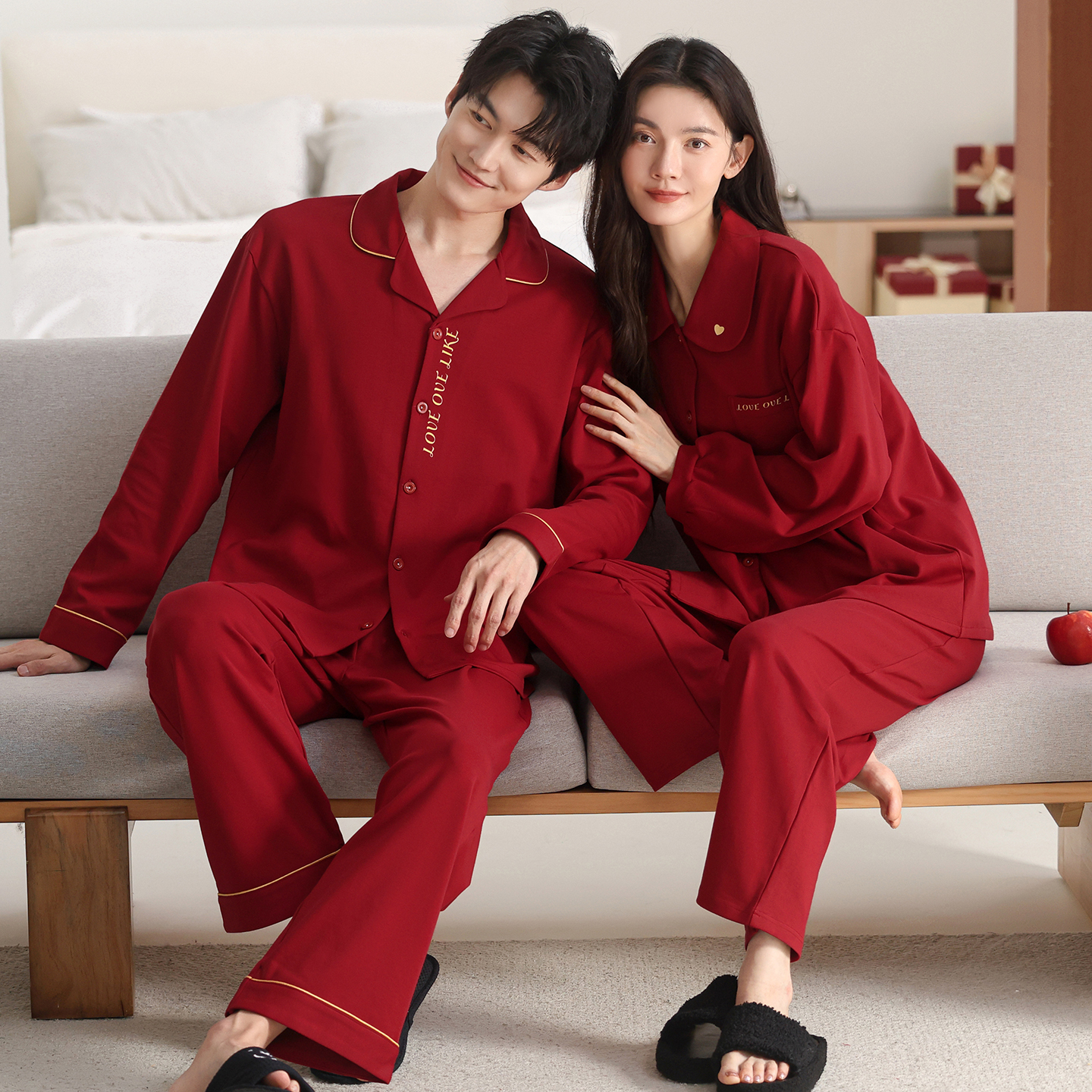 高级感开衫纯棉睡衣结婚新婚情侣套装新款春秋男女长袖红色家居服