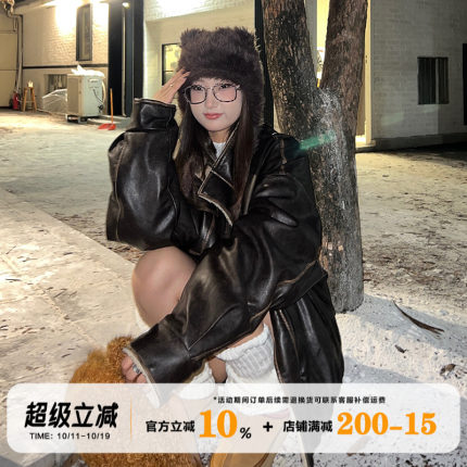饭饭又饿了美式皮毛一体羊羔毛外套女冬季加棉加厚机车皮衣夹克潮