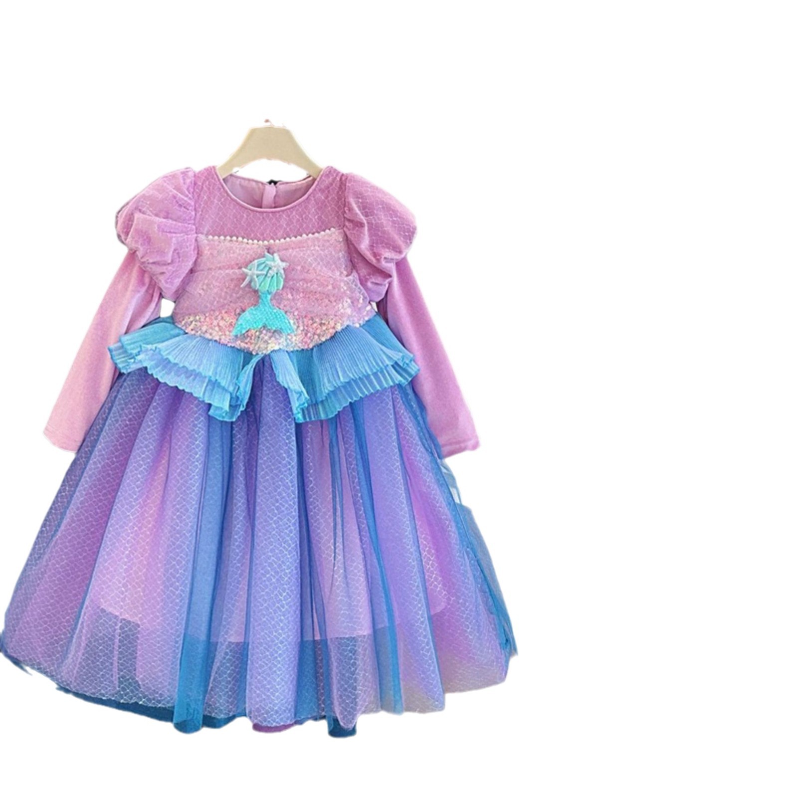 美人鱼公主裙秋冬款女孩高级感洋气紫色亮片长袖丝绒生日蓬蓬礼服