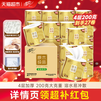 【李昀锐同款】下拉享优惠清风卷筒纸金装4层200克27卷卷纸巾