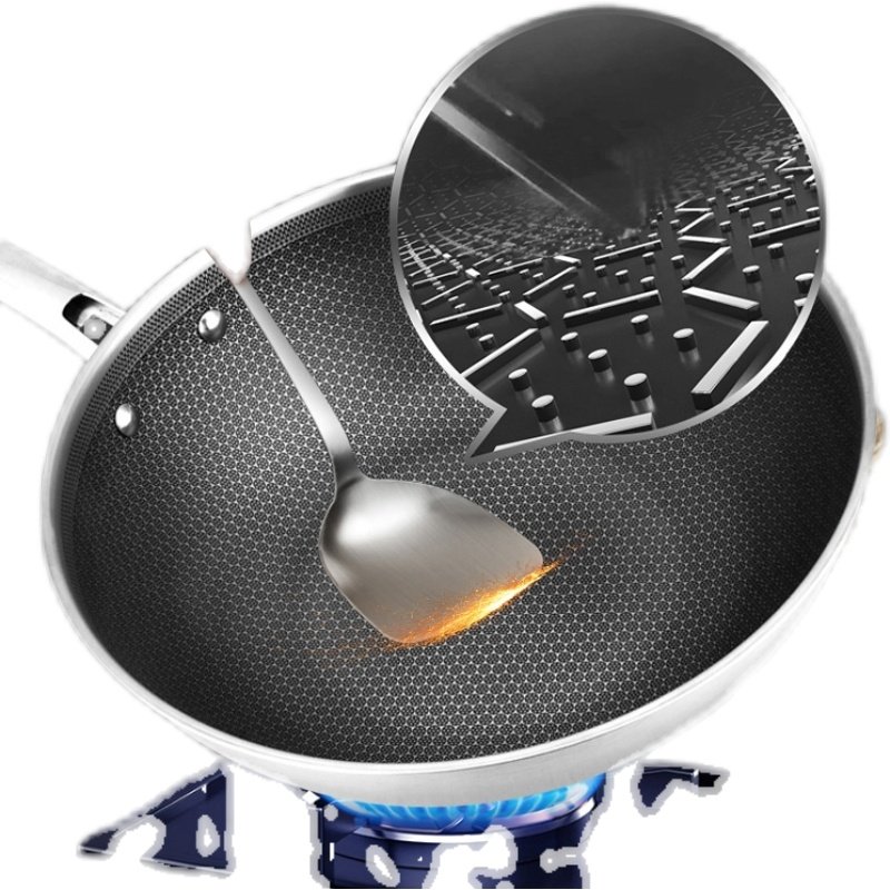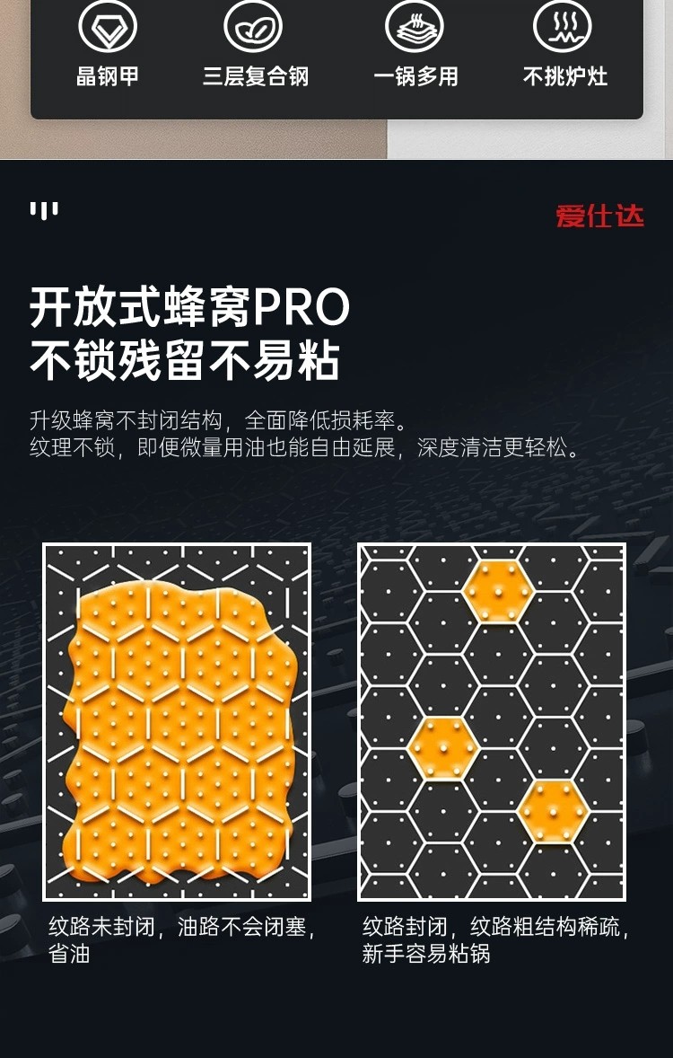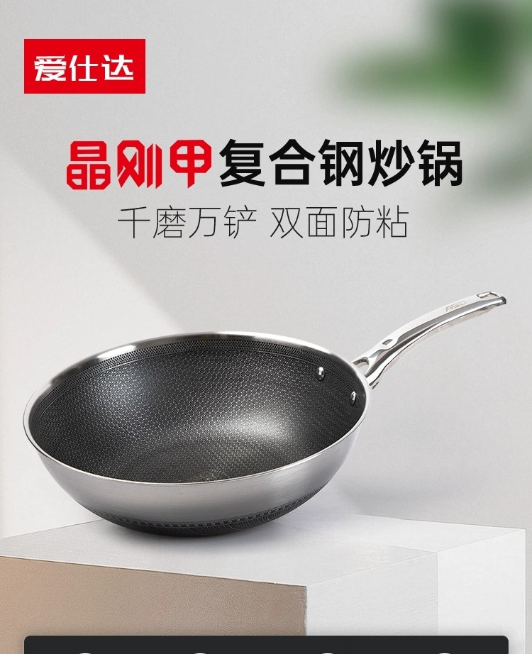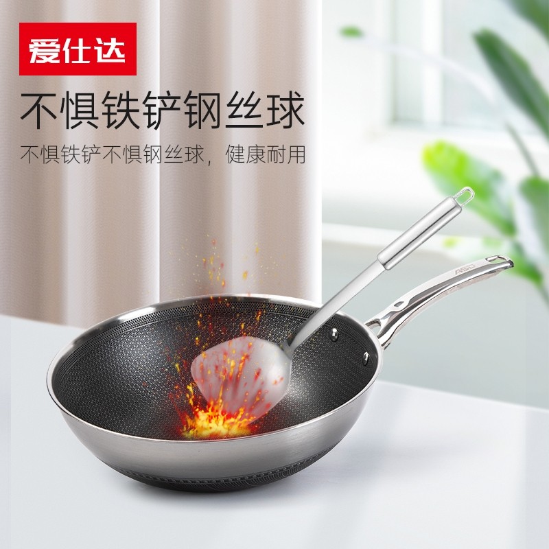 爱仕达晶刚甲复合钢炒锅316L不锈钢蜂窝双面不粘锅炒菜锅CC32E7J