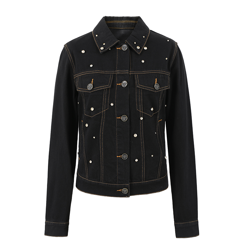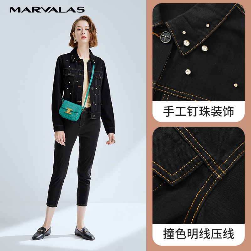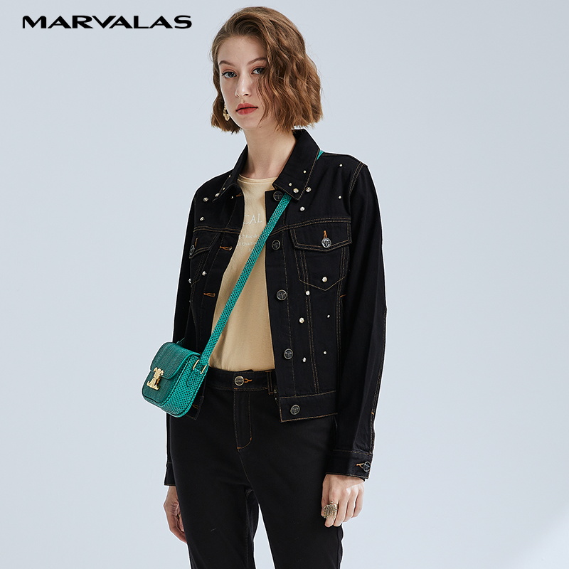 曼德诗黑色短款牛仔外套女2025秋季新款修身工装个性显瘦百搭夹克