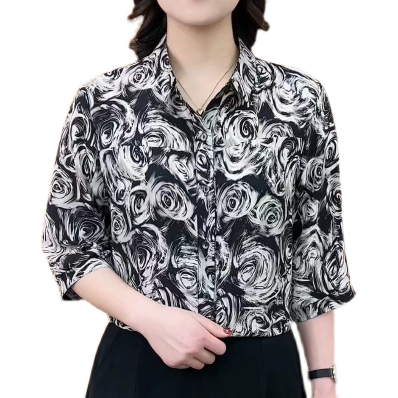 洋气小衫漂亮宽松遮肚上衣夏雪纺衫碎花中袖女七分袖别致上衣衬衫