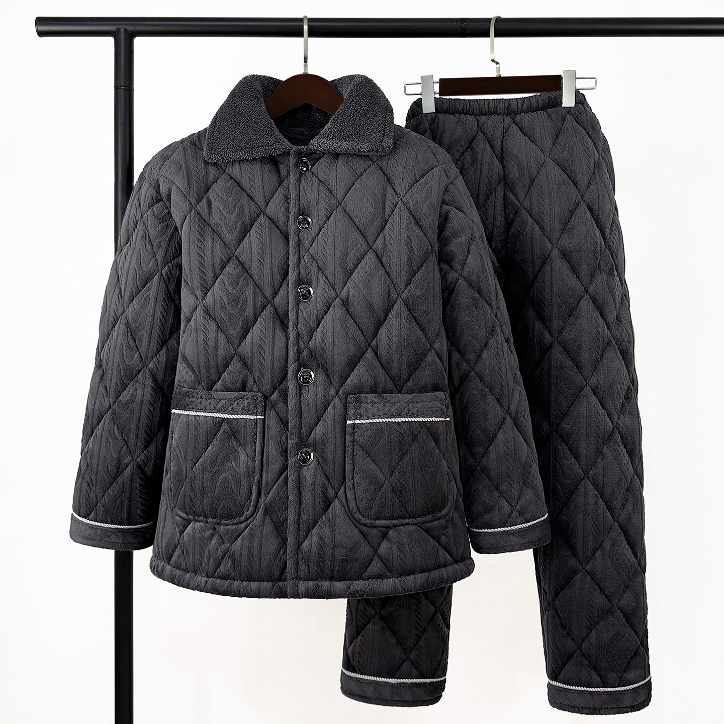男士秋冬季睡衣加厚加绒保暖三层夹棉中老年爸爸珊瑚绒家居服套装