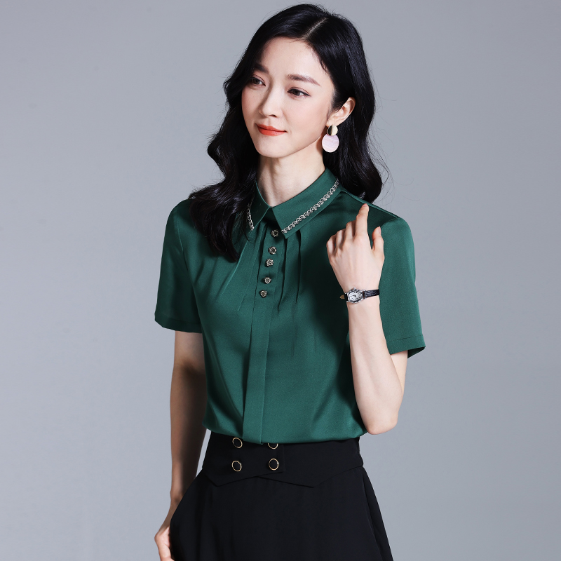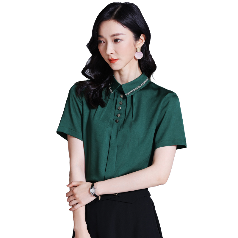 璐丝百丽墨绿色雪纺衫女短袖夏季职业衬衣时尚洋气小衫遮肚子上衣