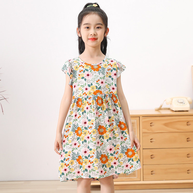 女童连衣裙棉绸外穿夏季薄沙滩裙碎花飞边袖公主裙宝宝儿童背心裙