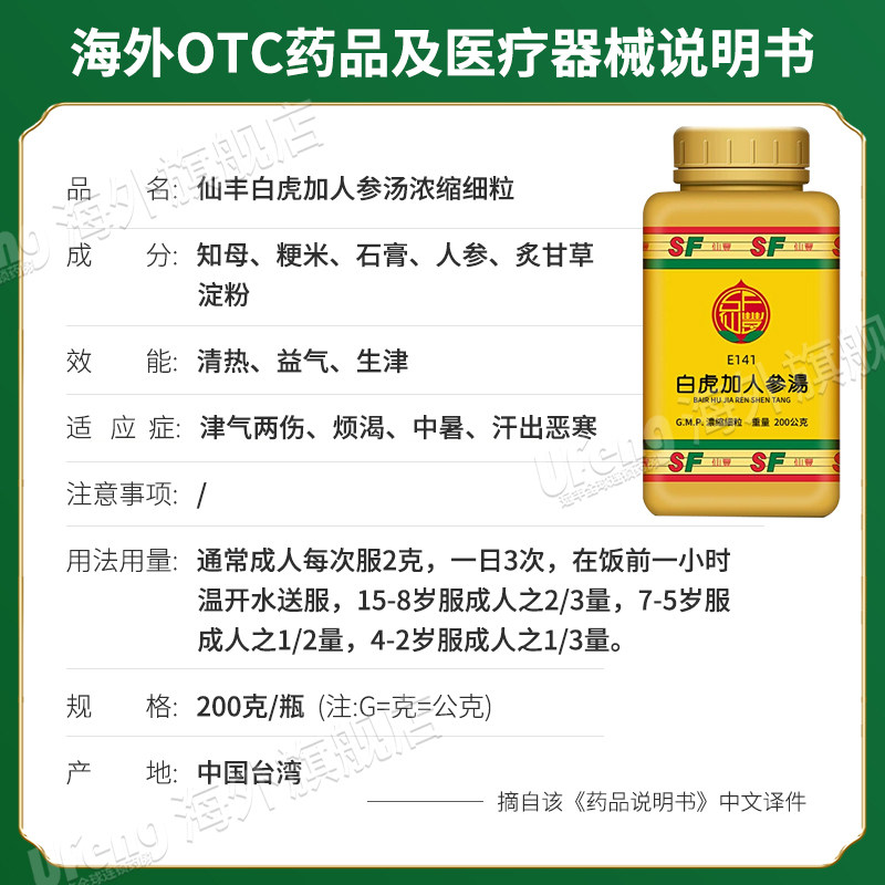 台湾仙丰白虎加人参汤倪海厦中成药津气两伤清热益气生津烦渴中暑