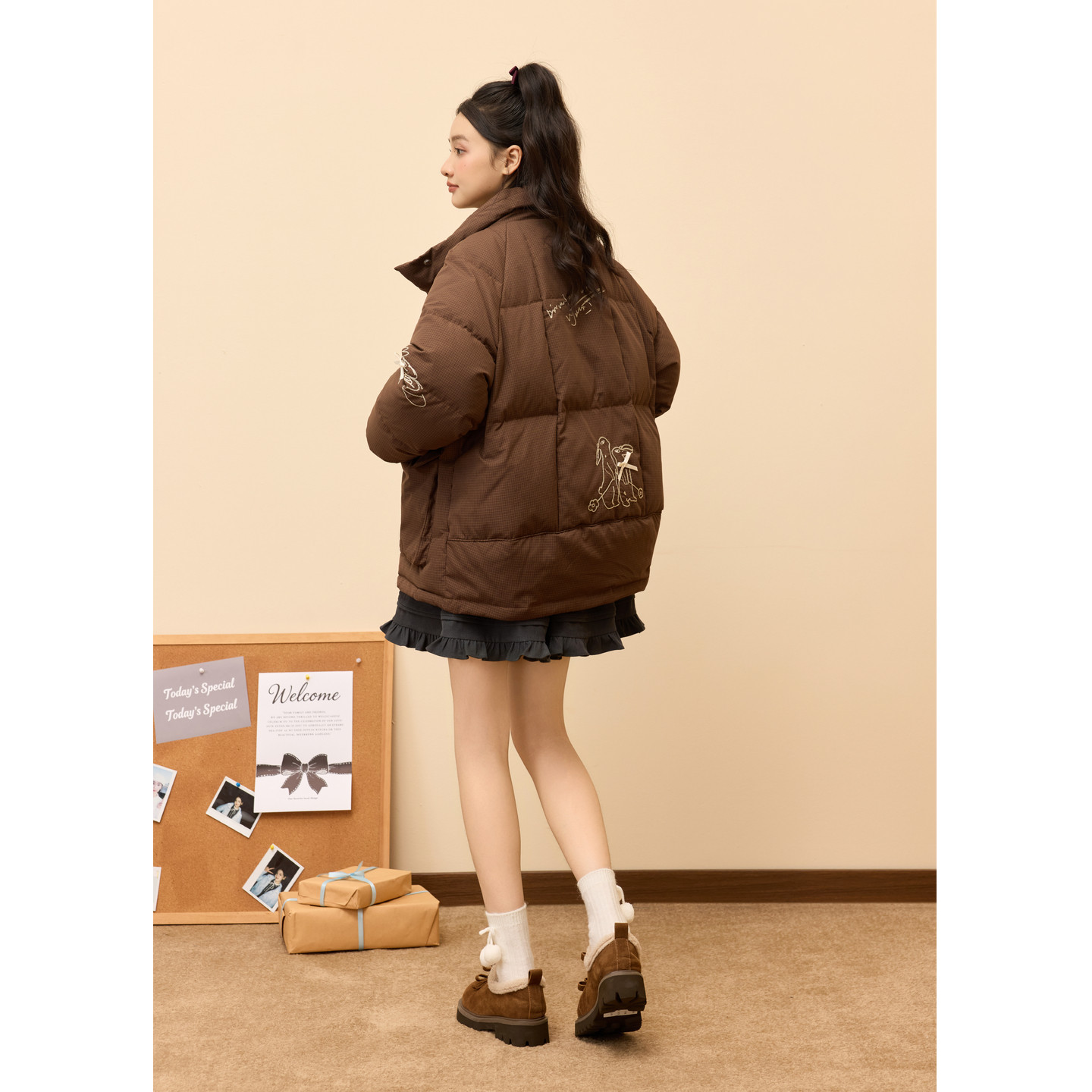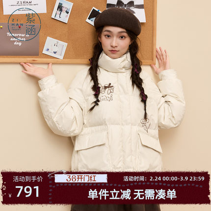 紫涵短款立领羽绒服女2025冬季新款工装口袋趣味刺绣宽松鸭绒外套